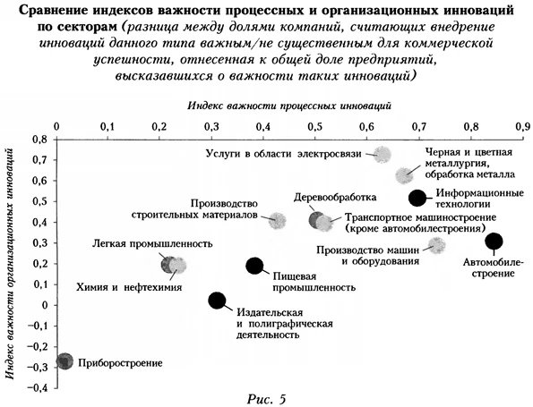 Как уже отмечалось, дополнительную характеристику значения фактора новизны продукции для конкурентоспособности по отраслям можно получить, учитывая долю компаний, отметивших новизну продукции среди преимуществ других участников рынка. В секторальном разрезе наиболее сильно этот вид конкурентного давления ощущают предприятия автомобилестроения (40%), транспортного машиностроения (33%), легкой промышленности (24%), приборостроения (22%), ИТ (22%). Наименее значим этот фактор в металлургии (5%), услугах в области электросвязи (14%). Здесь, по-видимому, играют роль сохранение относительно высокого уровня монополизма в этих отраслях, а также структура основных рынков, на которых реализуется продукция компаний данных отраслей. Отметим еще один факт, требующий проведения более глубоких исследований. Российские компании при формировании стратегий развития в большей степени ориентируются на фактор технологической экспансии конкурентов, чем на собственную инновационную активность. По положительной разнице между двумя оценками — значение инновационного давления со стороны конкурентов и новизна собственной продукции — лидируют транспортное машиностроение, автопром, деревообработка, пищевые производства. Большее значение собственному фактору новизны придают компании четырех секторов — электросвязь, информационные технологии, приборостроение и металлургия. Причем в ИТ и приборостроении высоко оценивается и технологическое давление со стороны конкурентов; в металлургии в принципе технологический фактор не считается важнейшим конкурентным преимуществом; в электросвязи при акценте на собственные силы роль инновационной активности конкурентов считается малозначимой. Интересно, что распределение предприятий по параметру конкурентного давления довольно тесно коррелирует с интенсивностью приобретения ими технологий. Здесь лидирует группа компаний высокотехнологичных производств, легкой и пищевой промышленности, химии и нефтехимии16. Инновации и конкурентная стратегия предприятий: оценка эффекта внедрения процессных и организационных инновацийВ последние 10 — 15 лет за рубежом в процессе становления и развития НИС внимание стали уделять не технологическим инновациям, которые играют особую роль, в том числе в модернизации и повышении эффективности производства, активизации инновационной деятельности. К ним в международной практике относятся организационные и маркетинговые нововведения17, которые составляют значимый блок стратегий развития компаний. В России такие нововведения внедряются менее активно, чем технологические инновации: активность внедрения организационных нововведений в промышленности ниже почти в три раза (3,5%), маркетинговых — почти в четыре (2,5%)18. Несколько лучше (хотя и не принципиально) ситуация в высокотехнологичных отраслях, а также ряде среднетехнологичных секторов (например, в химической и нефтехимической промышленности). При этом приоритет российские предприятия отдают достаточно узкому спектру организационных изменений (развитие персонала, применение современных систем контроля качества и сертификации продукции/ услуг, внедрение новейших методов управления на основе ИКТ). Их практикует более 60% промышленных предприятий. Напротив, фактически не используются такие эффективные органи