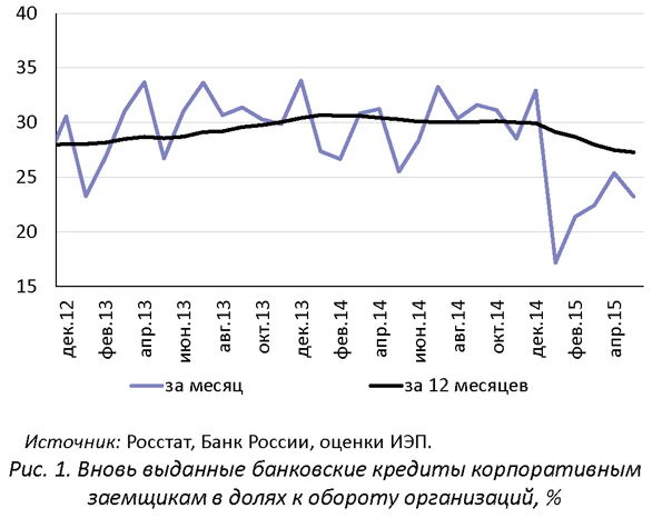 Рост процентных ставок с начала года и ухудшение обслуживания заемщиками текущей кредитной задолженности привели к значительному сжатию кредитного рынка - в январе-мае 2015 г. банки сократили выдачу новых на 17,5% к тому же периоду 2014 г. Объем выданных кредитов по отношению к обороту организаций упал до 22,0%. Более низкая кредитная активность была зафиксирована лишь в 2010 г. Объем просроченной задолженности с 1 января по 1 июня 2015 г. увеличился на 30% и достиг на 1 июня текущего года 6,2% от общего объема задолженности, а по рублевым кредитам - 7,2%, что соответствует пиковым значениям прошлого, 2008-2009 гг., кризиса. Банки поддерживают спред между кредитной ставкой на срок до 1 года и ключевой ставкой Банка России на уровне 3,0-3,5 п.п. Соответственно, после снижения ключевой ставки в мае 2015 г. до 12.5% средневзвешенная ставка по кредитам юридическим лицам на срок до 1 года снизилась до 16% годовых. Банки балансируют на грани убыточности и не имеют собственных ресурсов для дальнейшего снижения ставок. В первые месяцы 2015 г. объем рынка корпоративного кредитования заметно уменьшился. за январь-май 2015 г. банки выдали клиентам -юридическим лицам новых кредитов в объеме 11,9 трлн руб., что на 17,5% меньше, чем в январе-мае 2014 г. (14,4 трлн руб.)1. Из этого объема кредитов в рублях было выдано 10,6 трлн руб., что на 16,9% ниже соответствующего показателя 2014 г. (12,7 трлн), а выдача новых кредитов в иностранной валюте сократилась более чем в два раза (с 49 млрд долл. за первые пять месяцев 2014 г. до 24 млрд долл. за такой же период 2015 г.). Объем выданных кредитов по отношению к обороту организаций в 2013-2014 гг. в среднем составлял за январь-май 28,5%. Это немного ниже, чем за год в целом вследствие сезонно сниженной кредитной активности в первые месяцы года. В январе - мае 2014 г. объем вновь выданных кредитов составил 30% от величины оборота, а в 2015 г. показатель упал до 22,0%. Более низкая кредитная активность была зафиксирована лишь в 2010 г., когда объем вновь выданных кредитов в январе -мае составил лишь 19,4% от оборота.