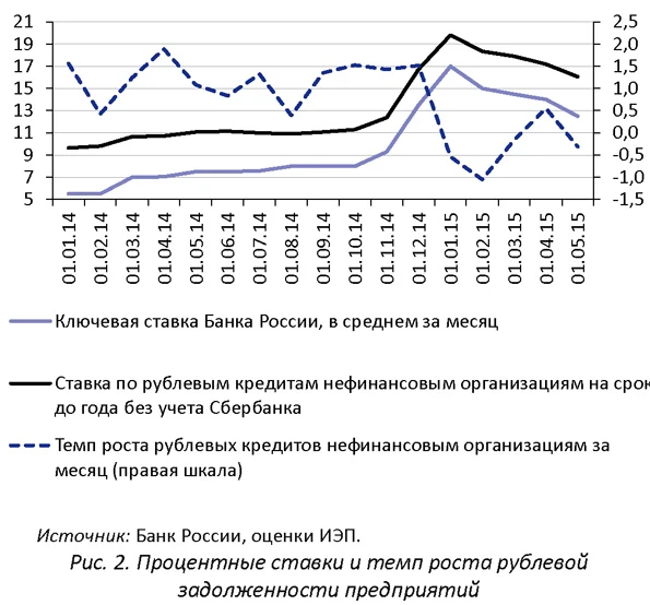 Сокращение объема выданных новых кредитов привело к уменьшению объема кредитной задолженности юридических лиц перед банками. За пять месяцев ее величина снизилась на 3,5% (или на 2,1% с поправкой на переоценку кредитов в иностранной валюте2), в том числе на 2,1% уменьшился объем задолженности по рублевым кредитам и на 3,0% по кредитам в иностранной валюте в долларовом выражении. ухудшается и качество кредитного портфеля: объем просроченной задолженности с 1 января по 1 июня 2015 г. увеличился на 30%. доля просроченной задолженности в общей величине задолженности корпоративных клиентов выросла с 4,6% на 1 января 2015 до 6,2% на 1 июня. При этом качество кредитов в национальной валюте и остается хуже, чем в иностранной, и рост доли просроченной задолженности по рублевым кредитам был больше: доля просроченных кредитов в рублях выросла с 5,5% до 7,2%, а доля просроченных кредитов в иностранной валюте - с 2,1% до 2,9%. В результате, доля просроченной задолженности почти вплотную приблизилась к максимумам 2009-2010 гг. (6,4% по всем кредитам, в том числе 7,2% по кредитам в рублях по состоянию на 1 июня 2010 г.), а по рублевым кредитам пиковый уровень прошлого кризиса уже достигнут. Еще один показатель качества кредитного портфеля - отношение резервов на возможные потери по кредитам к величине кредитной задолженности, - также ухудшается, хотя его динамика не так показательна, как рост просроченной задолженности. Величина резервов по кредитам корпоративным заемщикам за первые пять месяцев текущего года увеличилась на 13,8%, а ее отношение к объему кредитной задолженности выросло с 6,9% на 1 января 2015 г. до 7,9% на 1 июня 2015 г. При этом пиковый уровень 2010 г. был гораздо выше: тогда объем сформированных резервов на возможные потери достигал 11,5% от величины кредитной задолженности. Ключевой причиной замедления кредитования стал высокий уровень процентных ставок. Особенно это было заметно в первые месяцы года, когда резкий рост ставок банковского кредитования, последовавший за увеличением ключевой ставки Банка России, привел к резкому снижению кредитной задолженности корпоративных заемщиков. При этом банки устойчиво сохраняют спред между кредитной ставкой на срок до 1 года и ключевой ставкой Банка России на уровне 3,0-3,5 п.п. Соответственно, в январе 2015 г., когда ключевая ставка составлял 17% годовых, банки кредитовали юридических лиц почти по 20% годовых. После снижения ключевой ставки до 12,5% в мае 2015 г. средневзвешенная ставка по кредитам юридическим лицам на срок до 1 года снизилась до 16% годовых. Тем не менее динамика кредитования так и не восстановилась. За период январь-май 2015 г. лишь в апреле объем рублевой задолженности увеличился. В апреле же 2015 г. наблюдалось и максимальное в текущем году соотношение вновь выданных кредитов и оборота организаций - 25,4%. В остальные месяцы текущего года задолженность предприятий по банковским кредитам сокращалась, несмотря на последовательное снижение стоимости заимствований.