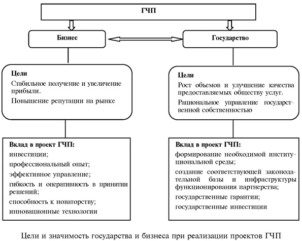 Очевидно, что в самом понятии «государственно-частное партнерство» заложено взаимодействие двух партнеров, имеющих разные цели: государства как представителя общественных интересов, и частного сектора. При этом государство должно трактоваться, в широком смысле, как обобщающий субъект общественной власти, включающий все уровни управления — федеральный (национальный), региональный и муниципальный. Основа концепции ГЧП состоит в том, что государство и бизнес обладают своими собственными специализациями и преимуществами, при объединении которых формируется кооперация и создается эффект синергии. Таким образом, можно сформулировать следующее определение: государственно-частное партнерство — институциональный и организационный альянс государства (или муниципальной власти) и бизнеса, подразумевающий объединение материальных и нематериальных ресурсов обеих сторон на взаимовыгодной договорной основе в целях реализации общественно значимых проектов и программ в широком спектре сфер деятельности: от базовых отраслей промышленности и НИОКР до оказания общественных услуг. Цели государственно-частного партнерстваПоскольку при государственно-частном партнерстве речь идет о взаимовыгодном партнерстве, то ключевым моментом взаимодействия является согласование целей и интересов каждой из сторон. Общие цели и значимость государства и бизнеса в ГЧП представлены здесь в виде схемы. Как видим, партнерская деятельность государства и бизнеса преследует, в конечном счете, социальные и экономические цели по созданию необходимых условий для функционирования хозяйственного комплекса и обслуживания потребностей населения, рационального управления государственной собственностью, доступности инфраструктуры, инновационного развития экономики страны. При этом каждая из сторон вносит свой вклад в общий проект. Со стороны бизнеса таким вкладом являются: финансовые ресурсы, профессиональный опыт, инновационные технологии, эффективное управление и т. д. Со стороны государства — возможность предоставления гарантий, налоговых и иных льгот, а также получение некоторых объемов финансовых ресурсов.
