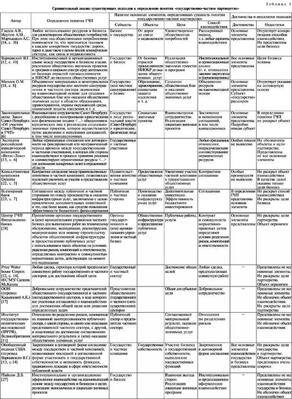 Жеребов Е.Д. В условиях реализации стратегической задачи инновационного развития экономики России все более актуальным становится формирование концепции эффективного управления. При этом основным элементом организации эффективного управления является налаживание взаимодействия органов государственной власти и частного бизнеса и, как следствие, использование механизма государственно-частного партнерства (далее — ГЧП). Взаимодействие органов государственной власти и частного бизнеса для решения важнейших, общественно значимых задач имеет давнюю историю не только в мире, но и в России. Ниже мы проведем анализ понятия «государственно-частное партнерство», рассмотрим цели и значимость каждого из участников государственно-частного партнерства и проведем классификацию его элементов. Методика и результаты исследованияАнализ понятия «государственно-частное партнерство»Следует отметить, что в научной литературе встречаются разные термины, обозначающие рассматриваемую форму взаимодействия государства и бизнеса: «государственно-частное партнерство», «публично-частное партнерство», «общественно-частное партнерство» [12, 15, 17, 19]. Ученые, ставя на первое место в названии партнерства государство или бизнес, в большинстве случаев подчеркивают главенствующую роль и инициативу со стороны государства или бизнеса в реализации партнерских проектов. Однако во многих случаях употребление той или иной формы определяется в значительной степени личными их предпочтениями. Учитывая исторические и современные особенности экономики России, где государство, как правило, является инициатором таких проектов, считаем более обоснованным применение понятия «государственно-частное партнерство». Более значимо здесь не столько различие в терминологии, сколько расхождение в определении сущности ГЧП среди исследователей данного вопроса. Выделим и рассмотрим несколько точек зрения и подходов относительно толкования понятия «государственно-частное партнерство». При рассмотрении существующих определений государственно-частного партнерства будем опираться на предположение, что определение, наиболее полно освещающее суть такого взаимодействия, как ГЧП, должно включать следующие обязательные элементы: основные субъекты, объекты, цели и способы взаимодействия. Исходя из данного предположения, представим в табличном виде несколько определений понятия «государственно-частное партнерство» (см. табл. 1) и проанализируем полноту раскрытия его сущности в этих определениях. Таблица 1 Сравнительный анализ существующих подходов к определению понятия «государственно-частное партнерство»В результате проведенного анализа подходов к определению понятия ГЧП, можно отметить следующие недостатки в большинстве случаев присущие разным авторам: