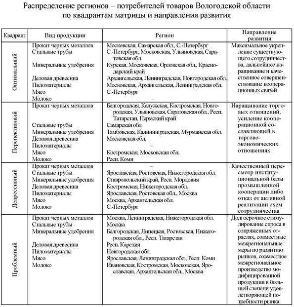 Торгово-экономические отношения практически со всеми регионами-потребителями характеризуются наличием проблем (за исключением Республики Коми, имеющей перспективные связи). В отношении данных регионов основным направлением развития сотрудничества должно стать повышение удельного веса долгосрочных устойчивых контрактов. Проведенное распределение регионов по квадрантам матрицы позволяет определить направления развития торгово-экономического сотрудничества в разрезе поставляемых товаров (табл. 5). Таблица 5
