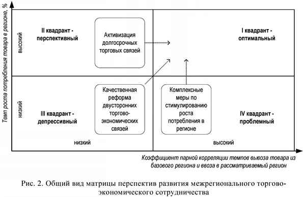Для определения перспектив увеличения объемов межрегионального вывоза конкретных товаров целесообразно использовать матрицы перспектив развития межрегионального торгово-экономического сотрудничества, построенные на базе методологии портфельного анализа (рис. 2) [5].