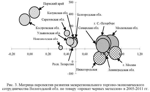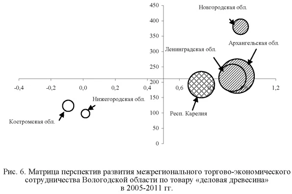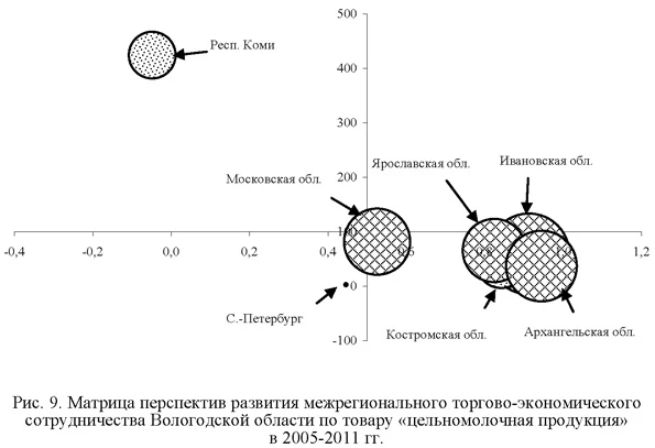 В целом выполнение вышеперечисленных задач позволит активизировать межрегиональное экономическое сотрудничество, превратить его в важный фактор роста экономики региона. 1 Поскольку количество точек наблюдения ограничивалось временным интервалом (2000-2012 гг.), не позволяющим получить статистически надежных оценок, то увеличение объема исходной информации осуществлялось посредством проведения процедуры агрегации торговых потоков, представленных по отдельным товарным позициям, в товарные группы межрегионального вывоза, межрегионального ввоза и экспорта в разрезе отраслей промышленности в виде панельной структуры. Основными отраслями обрабатывающей промышленности Вологодской области являются металлургическая (62,8% объема отгруженных товаров в 2012 г.), химическая (16,5%), пищевая (7,6%), машиностроительная (4,7%) и деревообрабатывающая (4,2%). 2 Количественной границей, разделяющей ось абсцисс на высокие и низкие значения коэффициента парной корреляции, является 0,5 (меньшие значения данного параметра свидетельствуют о крайне низком уровне взаимосвязи темпов вывоза и ввоза). 3 Под базовым регионом понимается регион, для товаров которого проводится анализ, под рассматриваемым — регион, в который направляются поставки из базового региона (регион-потребитель). Количественной границей, разделяющей ось ординат на высокие и низкие значения, является темп роста объема вывоза исследуемого товара из базового региона. В том случае, если темп роста менее 100% (вывоз сокращается), за границу принимается значение, равное 100%. 4 На рис. 3-9 значение показателя на графике отображает диаметр круга. 5 На рис. 5 не представлены Калининградская (-0,11; 1912) и Тамбовская (0,13; 671) области. 6 На рис. 6 не представлена Московская область (0,41; 1326). В скобках — координаты по оси абсцисс и оси ординат соответственно. Выделенные числа соответствуют темпам роста потребления (ввоза из базового региона) товара в рассматриваемом регионе. Литература 1. Гранберг А.Г. Основы региональной экономики. М.: ГУ ВШЭ, 2004. 2. Лукин Е.В. Межрегиональные связи: состояние и проблемы развития (на примере Вологодской области) // Экономические и социальные перемены: факты, тенденции, прогноз. 2012. № 6 (24). 3. Белоусова А.В. Межрегиональные взаимодействия: влияние на экономику региона // Пространственная экономика. 2012. № 4. 4. Межрегиональный товарообмен Вологодской области. Стат. сб. Вологда: Вологдастат, 2012. 5. Булатов А.Н. Стратегическая матрица перспектив промышленно-торговой межрегиональной кооперации //Российский экономический интернет-журнал. 20010. № 4. 6. Регионы России. Социально-экономические показатели. Стат. сб. М.: Росстат, 2012. 7. Смирнова Т.Г., Лукин Е.В. Роль экономического взаимодействия территорий в развитии промышленности (на примере Вологодской области) //Проблемы развития территории. 2011. № 2 (54). 8. Ускова Т.В., Лукин Е.В. Межрегиональное взаимодействие как фактор роста экономики. Препринт. Вологда: ИСЭРТРАН, 2013. 9. Москвина О.С. Межрегиональные связи Вологодской области //Экономические и социальные перемены в регионе: факты, тенденции, прогноз. 2004. № 24.