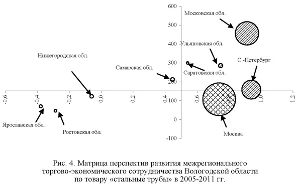 Оптимальными с точки зрения развития торгово-экономических связей являются Московская и Самарская области, Санкт-Петербург. На их рынки направляется около трети проката, вывозимого Вологодской областью в другие российские регионы, поставки растут устойчивыми темпами. Перспективными является большая группа регионов Приволжского (Пермский край, Республика Татарстан, Ульяновская и Саратовская области) и Центрального (Костромская, Калужская, Белгородская области) федеральных округов. Задача органов власти Вологодской области - укрепление долгосрочных торговых связей с данными регионами. Примечательно, что по прокату черных металлов экономические связи ни с одним регионом нельзя охарактеризовать как депрессивные. Между тем с тремя довольно крупными потребителями проката, имеющими развитую базу машиностроения связи оказались проблемными - с Москвой, Нижегородской и Ленинградской областями. В отношении перечисленных регионов необходимы комплексные меры по стимулированию роста потребления. География вывоза стальных труб моноструктурна - 4/5 объема межрегиональных поставок направляются в три региона с активно развивающейся строительной индустрией - в Москву и Санкт-Петербург, Московскую область. Оставшаяся 1/5 часть вывоза приходится на ряд других регионов - Ульяновскую, Саратовскую, Самарсккую, Нижегородскую, Ярославскую, Ростовскую области. Матрица перспектив развития межрегиональных поставок стальных труб (второго по объемам реализации товара Вологодской области) показана на рис. 4. Межрегиональные связи с крупными регионами-потребителями стальных труб (Московской областью, Санкт-Петербургом) можно оценить как оптимальные (за исключением проблемных связей с Москвой).