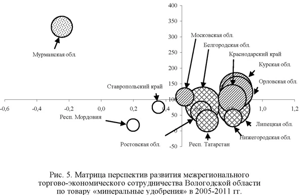 Как депрессивные можно охарактеризовать межрегиональные связи с тремя регионами - Нижегородской, Ярославской и Ростовской областями. Коэффициенты парной корреляции темпов вывоза стальных труб из Вологодской области и ввоза в эти регионы является отрицательным, что свидетельствует о крайнем несовпадении циклов производства и потребления данного товара. Возможно, экономически целесообразнее отказаться от активной реализации схем сотрудничества с некоторыми из этих регионов. Вид матрицы перспектив развития межрегиональных поставок минеральных удобрений близок к оптимальному (рис. 5)5. С наиболее крупными их потребителями (Курская, Орловская, Тамбовская, Белгородская, Калининградская, Мурманская области, Краснодарский край) связи либо находятся в оптимальном состоянии, либо близки к его достижению. С данными регионами следует совершенствовать налаженное торгово-экономическое сотрудничество, повышать удельный вес устойчивых долгосрочных контрактов, институционализировать отношения, в том числе с участием властей регионов.