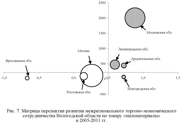 Большая часть пиломатериалов (61% межрегиональных поставок) также направляется лишь в два региона - Москву и Московскую область [4]. Однако торговые связи с Москвой можно оценить как депрессивные, поэтому необходимы активные мероприятия по восстановлению с ней торгово-экономических отношений (рис. 7).
