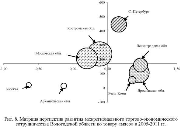 Кроме того, производителям деловой древесины и пиломатериалов Вологодской области следует расширить географию поставок, активизировать долгосрочные кооперационные связи с потребителями из рассмотренных регионов параллельно с активизацией мероприятий по повышению конкурентоспособности производимой продукции. Область является одним из крупнейших поставщиков продукции деревопереработки на российский рынок, обеспечивая 35% рынка деловой древесины и 8% продукции более высокого передела - пиломатериалов [6]. В этой связи важным элементом развития межрегионального торгово-экономического сотрудничества является увеличение глубины переработки продукции, производимой предприятиями региона [7; 8]. Матрица перспектив развития межрегиональных поставок мяса показана на рис. 8. Регионом с оптимальными связями по данному товару является только Санкт-Петербург.
