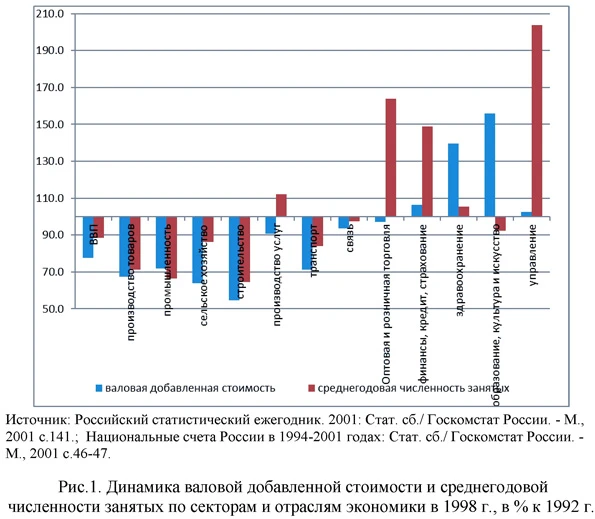 Лугачева Л.И. Трансформационные сдвиги в период 1992-1998 гг. определили основные тенденции динамики и структуры спроса на рабочую силу в последующие годы. Резкое падение объемов производства усилило межотраслевую, межсекторальную и межрегиональную мобильность рабочей силы. Формирование этой тенденции поддерживалось и усилившейся тенденцией к дифференциации оплаты труда по видам экономической деятельности. При общей тенденции к сокращению численности занятых в экономике изменение пропорций определялось повышением удельного веса занятых в секторе производства услуг. Если в 1992 г. доля занятых в секторе производства товаров составляла 55,0% и секторе услуг 45,0 % от среднегодовой численности занятых в экономике, то к 1998 г. фиксировалось обратное соотношение. Изменения структуры занятости в этот период определялись уменьшением занятости в промышленности и строительстве в 1998 г. относительно 1992 г.г. почти на 1/3 и сельском хозяйстве - более чем на 15% (рис.1). Формирование принципиально нового для российской экономики сектора услуг сопровождалось созданием дополнительных рабочих мест и привлечением рабочей силы. Увеличение численности занятых в секторе услуг за период 1992-1998 гг. более чем на 10% смягчало ситуацию на рынке труда и стало фактором, сдерживающим рост безработицы. Наиболее высокие темпы прироста занятости в этот период фиксировались в государственном управлении, финансово-кредитном секторе, оптовой и розничной торговле, что корреспондировало с основными тенденциями изменения структуры ВВП.