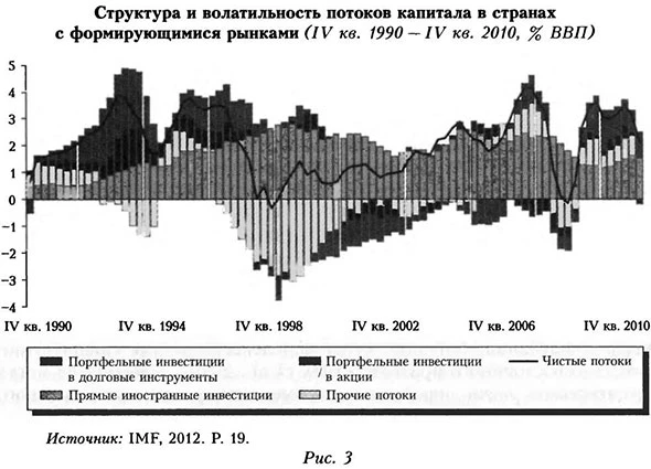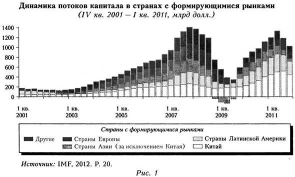 выполненных за счет бюджетных средств по Тематическому плану НИР Финансового университета при Правительстве РФ 2013 г. С началом посткризисного восстановления мировой экономики возобновился приток иностранного капитала в страны с формирующимися рынками. Прежде всего увеличился приток капитала в страны Азии и Латинской Америки, для экономик которых характерны относительно высокие темпы роста. Данный процесс при возможном изменении ряда внешних (углубление кризиса в ЕС, усиление борьбы с уклонением от уплаты налогов) и внутренних (снижение инвестиционных и административных рисков) условий может затронуть и Россию1. Так, во II квартале 2012 г. наблюдался чистый приток в РФ иностранного капитала в объеме 9,5 млрд долл.2 Эта тенденция может возобновиться в 2013—2015 гг., если в стране резко возрастет внутренний спрос на долговое финансирование для обновления основных фондов в промышленности, развития транспортной инфраструктуры и производств с высокой добавленной стоимостью3. Но, как показал недавний глобальный финансовый кризис, масштабный приток иностранного капитала, наряду с экспортными доходами, для стран-реципиентов сопряжен с факторами системного риска, а также ускорением темпов инфляции и одновременным укреплением национальной валюты (Кудрин, 2013). Поэтому для поддержания макроэкономической и финансовой стабильности странам-реципиентам приходится корректировать внутреннюю финансовую политику, чтобы минимизировать возможный ущерб от реализации системного риска. В статье показано, как органы финансового регулирования стран с формирующимися рынками корректируют рыночные провалы, связанные с притоком иностранного капитала (в форме прямых и портфельных иностранных инвестиций, международных кредитов и трансфертов). Макропруденциальная политика и капитальный контрольПосле завершения острой фазы глобального кризиса возобновился приток иностранного капитала в страны с формирующимися рынками (см. рис. 1). Это потребовало от органов финансового регулирования перехода к использованию инструментов макропруденциальной политики.