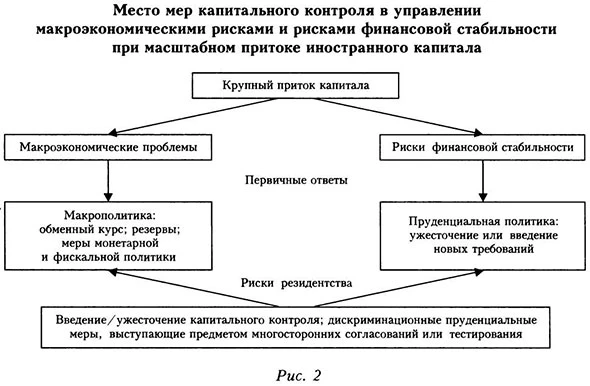 В ряде указанных ситуаций отдельные центральные банки стран с формирующимися рынками вводят меры косвенного капитального контроля по соображениям либо макроэкономической, либо финансовой стабильности. Особенно широко такие меры применяют в условиях, когда традиционные пруденциальные инструменты не позволяют регулирующим органам эффективно абсорбировать приток иностранного капитала и/или минимизировать его негативные последствия для реального сектора экономики. На рисунке 2 показано, почему масштабный приток иностранного капитала может потребовать мер прямого (если финансовый счет не либерализован) или косвенного (если он либерализован) капитального контроля для поддержания макроэкономической и финансовой стабильности. Меры макроэкономической политики отнесены к первичным ответам регулирующих органов на риски, порождаемые наплывом иностранного капитала. Меры пруденциальной политики рассматриваются в качестве первоочередных при ограничении рисков финансовой стабильности. Но на практике возможно сочетание различных инструментов монетарной и фискальной политики. Например, завышение обменного курса национальной валюты можно использовать для сдерживания притока иностранного капитала, способного вызвать повышение цен на рынках недвижимости и национальных активов (то есть для ограничения риска финансовой нестабильности, имеющего макропоследствия). Контрциклическое регулирование центральным банком норматива LTV (отношения суммы кредита к стоимости обеспечения) может замедлить инвестиционный бум, подпитываемый иностранным капиталом. В результате темпы роста совокупного кредитования в национальной экономике замедлятся и снизится риск ее перегрева (данная мера вводилась в Греции в 2003—2007 гг., Ю. Корее — в 2008 г. и Перу - в 2007-2008 гг.).