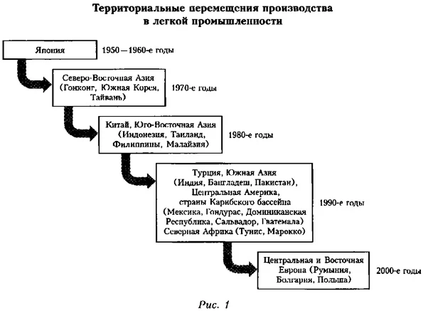 Наряду с массовым переносом производства в Азиатский регион компании из развитых стран переносили производства в близлежащие страны (экономя на издержках транспортировки) и страны, с которыми исторически сложились более тесные связи: американские компании двигались в Мексику и страны Карибского бассейна, французские и итальянские — в Тунис и Марокко, немецкие — в Турцию. Западноевропейские страны пришли также в страны ЦВЕ (Румыния, Болгария, Польша). Сами же ведущие западноевропейские страны (Германия, Франция, Италия) сохранили определенную долю производства и экспорта, по преимущественно в более технологичных сегментах и производствах из более качественного сырья (натурального и синтетического) высококачественной продукции с высокой добавленной стоимостью (Gereffi, Memodovic, 2003; Lopez-Acevedo, Robertson, 2012). Территориальные сдвиги были сопряжены с изменением моделей организации цепей поставок. Так, страны Северо-Восточной Азии перешли от простого конвейерного производства ири котором они работали на импортных полуфабрикатах и заготовках, по чужим лекалам и технологиям, под жестким контролем ведущих западных фирм — к более сложной системе предоставления полного комплекса услуг (full-package sourcing). Новая модель предполагала более высокую степень автономии, более развитые компетенции производителей, которые начинают сами определять способы производства, сами изготовляют полуфабрикаты и заготовки. Здесь появляются элементы оригинального производства готовой продукции, а в дальнейшем производство собственных брендов (original brand name manufacturing, OBM), значительная часть которого связана с копированием современных образцов из более развитых стран. В целом это привело к переходу от «кэптивной» модели (captive model), связанной с жестким контролем со стороны заказчиков, к отношенческой модели (relational model), где отношения производителей и закупщиков становятся более партнерскими и основанными на взаимозависимости (Gereffi, Humphrey, Sturgeon, 2005). Наряду с этим в Азии (Япония, Гонконг) возникли мощные посредники — крупные торговые фирмы, размещающие заказы среди множества некрупных фирм в соответствии с существовавшими с 1970-х годов до 2005 г. квотами. Относительно простое конвейерное производство с более жестким контролем со стороны закупщиков перемещается в менее развитые страны Юго-Востока, а затем Юга Азиатского региона. В Европе сложилась иная модель, построенная не на прямом импорте продукции странами ЕС, а на основе системы вынесенной переработки (outward processing trade), или давальческих схем. В этой системе развитые западноевропейские страны экспортируют материалы и заготовки в страны Центральной и Восточной Европы (ЦВЕ), а затем реимпортируют готовую одежду после ее изготовления (Hanzl, Havlik, 2003). С началом реформ и распадом Совета экономической взаимопомощи (СЭВ) легкая промышленность в странах ЦВЕ испытала серьезный спад, и включение в систему вынесенной переработки позволило его приостановить (по крайней мерс, до шока 2005 г., связанного с отменой квот в рамках ВТО). В ходе волн индустриализации некоторые страны поднимались по шкале развития, переходя от простого конвейерного производства к подключению функций закупок и дистрибуции, затем к более сложному производству чужих брендов с элементами собственного дизайна, наконец, к созданию собственных брендов. Одновре