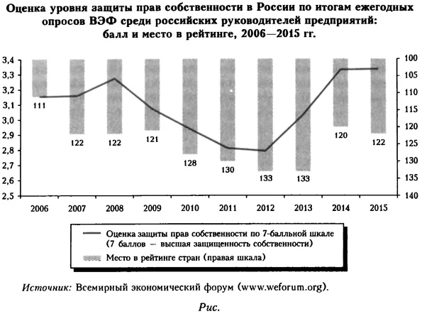 При анализе этих проблем, прежде всего последней, особого внимания заслуживают два фактора. Во-первых, социальное неравенство при сложной ситуации с собственностью и корпоративным контролем. Во-вторых, поведение элит, которые откладывают решение этой проблемы, оттягивая возможности инвестиционного подъема. Решение макроэкономических и социальных проблем, вопросов организации управления и финансов в большой степени зависит от того, как «работает» собственность в рамках государственного и частного бизнеса, определяя превращение национальных сбережений в новые производительные, инфраструктурные и человеческие активы. Незащищенность прав собственности в России: современные характеристикиОсновным источником развития экономики и общества выступает стремление людей повысить свое благосостояние. Высокий риск вынужденной потери дохода или имущества снижает или даже отменяет стимулы к труду, предпринимательству и инвестициям, что в итоге приводит к экономической стагнации. В данном случае проблема связана даже не с режимом или формой собственности — государственной или частной, а со степенью ее защищенности. И в мировой, и в российской истории было немало примеров подобных ситуаций. Они наблюдались в России в ходе трансформаций экономической системы в XX в., включая и революции начала века, и преобразования 1920-х и 1930-х, и реформы 1990-х годов. Прежде всего это периоды слабости государства, в том числе во время восстаний, гражданских войн, коренных политических преобразований. Заметим, что периоды усиления институтов государственной власти также могут характеризоваться слабой защитой прав собственности. Экономическому агенту все равно, откуда исходит риск экспроприации его имущества. В связи с этим для него представляет одинаковую опасность как слабость государства, так и его сила в отсутствие верховенства права. Сильное неправовое государство ослабляет рыночную экономику; сильное правовое государство поддерживает ее, в чем и состоит его роль. Один из ярких примеров в российской истории — опричнина Ивана Грозного. В. Кобрин указывает, что после начала периода опричнины, в 1570-1580-е годы, от 50 до 90% русских пахотных земель оказались в запустении. Частично это можно списать на эпидемии, частично — на налоговый гнет (также ставший следствием опричнины), но, как подчеркивает историк, сама опричнина имела ключевое значение: «И все же роль опричнины в запустении была исключительно велика. Материал для суждений об этом дают нам книги „обысков", расследований о причинах запустения тех или иных сел и деревень Новгородской земли. В некоторых случаях причиной гибели или бегства крестьян называют „немцев" — шведские войска, вторгшиеся в ходе Ливонской войны на часть территории Новгородской земли. Но куда больше записей такого рода: „...опритчиные на правежи замучили, дети з голоду примерли", „опритчина живот пограбели, а скотину засекли, а сам умер, дети безвесно збежали", „опричиныи замучили, живот пограбели, дом сожгли"» (Кобрин, 1989. Гл. II). Основные проблемы для стимулов экономических агентов порождает не только объективная ситуация, но и восприятие незащищенности прав собственности, которое может не вполне корректно отражать действительность, но оказывать решающее влияние на поведение агентов. Результаты опросов, отражающ