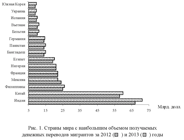Абылкасымова М.Е. Калимова Д.М. Актуальность вопросаРеспублика Казахстан (РК) в 2000-е годы стала региональным центром приема трудовых мигрантов из других стран - Кыргызстана, Таджикистана, Узбекистана. Это обусловлено различиями в динамике экономического роста и демографического потенциала стран Центральной Азии и Казахстана, несбалансированностью спроса и предложения на региональном рынке труда. Формирование Единого экономического пространства Беларуси, Казахстана и России также способствовало росту числа трудовых мигрантов. На этом фоне сформировались как регулируемые, так и нерегулируемые потоки миграции. Выявление реальной численности трудовых мигрантов является сложным вопросом вследствие нежелания значительной части мигрантов регистрировать трудовую деятельность. Так, по данным статистического портала ЕИС «Беркут» [1], за восемь месяцев 2013 г. в страну прибыло 4 млн. иностранцев, из которых в органах внутренних дел зарегистрировалось 636 тыс., причем из общего числа только 26 тыс. имели цель устроиться на работу. Вопрос выявления реальных размеров трудовой миграции имеет принципиальное значение для выработки адекватной политики занятости в стране, которая не может игнорировать неучтенные потоки нерегулируемой трудовой миграции. Для определения реальных размеров трудовой миграции может быть использован подход, основанный на учете денежных переводов трудовых мигрантов в страны исхода, который впервые был рассмотрен Евразийским банком развития [2]. Мировые тенденцииВ мире роль денежных переводов выехавших за рубеж трудовых мигрантов постоянно растет. Часто эти переводы являются вторым по значимости финансовым потоком в развивающихся странах после прямых иностранных инвестиций и почти в два раза больше сумм, которые данные государства получают по официальным каналам в виде помощи [3]. По оценкам Всемирного банка [4], денежные переводы в развивающиеся страны Европы и Центральной Азии в 2013 г. возросли на 10,8 % и достигли 42,6 млрд. долл. На 20 крупнейших стран-получателей приходится около 70% их общемирового объема. По обновленным оценкам, в 2013 г. список стран, в которые поступили наибольшие объемы денежных переводов мигрантов, вновь возглавили Индия (71 млрд. долл.) и Китай (60 млрд. долл.), за которым следовали со значительным отрывом другие развивающиеся страны: Филиппины - 26 млрд., Мексика - 22, Нигерия - 21 и Египет - 21 млрд. долл. (рис. 1).