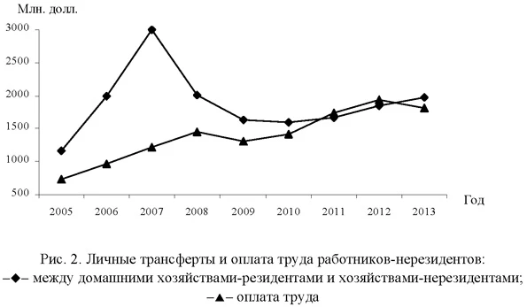 Самым крупным получателем денежных переводов мигрантов в регионе Европы и Центральной Азии остается Украина, но они составляют только 4,8% ВВП этой страны. Между тем в Таджикистане денежные переводы мигрантов составляют 48% ВВП, в Кыргызской Республике - 31%, Молдове - 24,5% ВВП [4]. Казахстан: трудовая иммиграция и денежные переводыТрудовая иммиграция в Казахстан происходит в двух формах: официального привлечения иностранной рабочей силы и стихийной трудовой иммиграции, преимущественно из стран Центральной Азии и России. Оба потока играют большую роль в удовлетворении потребности Казахстана в трудовых ресурсах и вносят значительный вклад в экономическое развитие республики [5].Основная масса мигрантов сконцентрирована в сельском хозяйстве, строительстве и сфере услуг. Привлечение нерегулируемой трудовой миграции в страну, прежде всего, связано с низкой стоимостью предоставляемых мигрантами услуг, отсутствием социальных пакетов и других условий [6]. В статистике внешнего сектора в структуре платежного баланса имеются статьи, которые могут характеризовать денежные потоки, создаваемые трудовыми иммигрантами в Казахстане - это «Оплата труда работников нерезидентов» и «Личные трансферты», перечисляемые за рубеж. Причем первый показатель характеризует легальную трудовую миграцию, которая связана с трудовой деятельностью иностранной рабочей силы, привлекаемой по разрешениям (регистрируемая трудовая миграция). Второй показатель косвенно указывает на наличие иммигрантов внутри страны, которые получают доходы от нелегальной трудовой деятельности и переправляют часть из них своим семьям в страны исхода (нерегистрируемая трудовая миграция). На рис. 2 показана динамика данных показателей за 2005-2013 гг. Как видим, объем оплаты труда нерезидентов интенсивно рос в 2005-2008 гг.: произошло увеличение ежегодного потока в два раза. В связи с последствиями мирового финансового кризиса в 2009-2010 гг. отмечалось небольшое снижение, но с 2011 по 2012 г. отмечается снова положительный рост оплаты труда нерезидентов.
