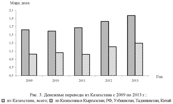 По личным трансфертам в 2005-2007 гг. наблюдался сильный рост ежегодного потока (в 2,6 раза) почти до 3 млрд. долл. в год. Затем, к 2010 г. поток личных трансфертов снизился до 1,6 млрд. долл. в год. В 2011-2013 гг. идет постепенное увеличение этого показателя почти до 2 млрд. долл. в год. По данным Национального банка РК [7], денежные переводы физических лиц были направлены в основном в пользу резидентов таких стран, как Российская Федерация, Узбекистан, Китай, Кыргызстан, и составляют около 60% в общем объеме денежных переводов из Казахстана (рис. 3).