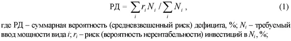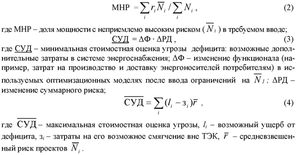 Оценка инвестиционного риска отдельных проектов, исключение их из состава рассматриваемых в случае неприемлемого риска, внесение соответствующих корректив в исходные данные оптимизационной модели ТЭК и проведение новой серии расчетов - наиболее очевидный в первом приближении способ учета возможной угрозы дефицита и снижения ее за счет структурных изменений в ТЭК. Однако этот способ не дает количественной оценки рискованности получаемого решения (варианта). Не определяются также вероятность и серьезность угрозы дефицита мощностей в случае реализации варианта в иных условиях. Теоретические разработки по оценке адаптивности вариантов в энергетике, по принятию решений в условиях неопределенности, успешно развивавшиеся в СССР (см. например, [9; 10]), не получили должного практического применения. За рубежом внимание к оценке рискованности вариантов развития энергетики усилилось только в последние 15-20 лет и сопровождалось усложнением методического инструментария для прогнозных исследований и расширением области применения метода статистических испытаний (метода Монте-Карло). Процедура статистических испытаний используется и в предлагаемом здесь подходе к количественной оценке угроз дефицита мощностей. Такие угрозы вначале определяются для отдельных макрорегионов, а затем для страны в целом. При этом задача формируется как оценка возможных рисков (надежности) энерго- и топливоснабжения рассматриваемой территории в условиях неопределенности [11]. Компьютерная программа для решения такой задачи (МИСС - Модель Имитационная Стохастическая Статистическая) разработана В.Н. Тыртышным.Очевидно, что как исходные данные для решения такого рода задач, так и получаемые оценки рискованности вариантов энергоснабжения отдельных регионов должны быть согласованы с общими прогнозными исследованиями ТЭК страны. При этом на очередной итерации расчетов оптимизационной модели ТЭК могут быть изменены ее региональная структура и ограничения на ввод мощностей с неприемлемо высокими инвестиционными рисками. Могут быть также скорректированы направления и пропускные способности межрегиональных энергетических потоков для снижения угрозы возможного дефицита мощностей. В качестве индикаторов энергетической безопасности, характеризующих угрозу дефицита мощности или риска вариантов энергоснабжения рассматриваемого региона, могут оказаться полезными следующие показатели: ![]()