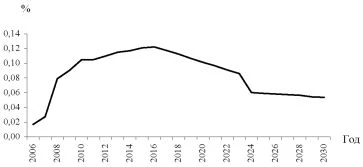 К 2020 г. общая сумма дисконтированньгх налоговых поступлений составит 174 млрд. руб., что в 2,4 раза превышает объем средств, необходимый для покрытия дефицита финансирования. Это свидетельствует о высокой бюджетной эффективности инвестиционной программы ОАО «Мосэнерго» даже без учета косвенных налоговых поступлений и остальных параметров, предусмотренных Методикой. Макроэкономическая эффективность инвестиционного проекта оценивается по его способности влиять на формирование ВВП. Оценка макроэкономической результативности базируется на определении прямого и косвенного макроэкономического эффекта для каждого года реализации проекта. Прямой макроэкономический эффект (ПМЭ) реализации инвестиционного проекта оценивается как объем ВВП, обусловленный инвестициями в основной капитал, и стоимостью товарной продукции, произведенной на созданных объектах в год без учета затрат на оплату товаров и услуг иностранных поставщиков и подрядчиков. Косвенный макроэкономический эффект (КМЭ) - дополнительные доходы, образующиеся в экономике под влиянием использования прямых (входящих в состав ПМЭ) доходов участников хозяйственной деятельности (населения, предприятий, государства) на покупки российских потребительских и инвестиционных товаров и услуг. Годовой индекс экономической эффективности инвестиционного проекта Эtг характеризует влияние инвестиционного проекта на рост ВВП (рис. 2) и оценивается по соотношению совокупного макроэкономического эффекта в ценах предыдущего года и объема ВВП предыдущего года, рассчитанного при условии отказа от реализации инвестиционного проекта: Эtг = ПМЭct / ВВПΛt-1. Выполненные расчеты выявляют следующие тенденции динамики годового индекса макроэкономической эффективности: - 2006-2012 гг. - рост значений индекса, обусловленный высоким уровнем инвестиционной активности; - 2013-2018 гг. - замедление роста в связи с окончанием строительства большинства объектов, дальнейший рост индекса обусловлен высокими уровнями тарифов для достижения целевых показателей эффективности; - 2019-2024 гг. - уменьшение значений индекса вследствие снижения уровней тарифов на электроэнергию до индикативных значений по достижении целевых показателей инвестиционных проектов; - 2024-2030 гг. - незначительное снижение значений индекса. К этому периоду по большинству проектов достигнуты целевые показатели эффективности, и тарифы на электроэнергию приняты на уровне индикативных значений. ![]() Рис. 2. Динамика годового индекса макроэкономической эффективности инвестиционных проектов ОАО «Мосэнерго» В качестве основного показателя экономической эффективности инвестиционного проекта используется интегральный индикатор экономической эффективности (Эинт), характеризующей часть суммарного ВВП за все годы расчетного периода, которая может быть обеспечена реализацией инвестиционного проекта: ![]() где It - индекс экономического роста в период t по данным прогноза; IΛt - индекс экономического роста в период t при условии отказа от реализации инвестиционного проекта. В соответствии с Методикой [6] инвестиционный проект признается соответствующим критерию экономической эффективности, если значение интегрального индекса превышает 0,01%. Получены следующие результаты расчета интегрального индекса экономической эффективности инвести