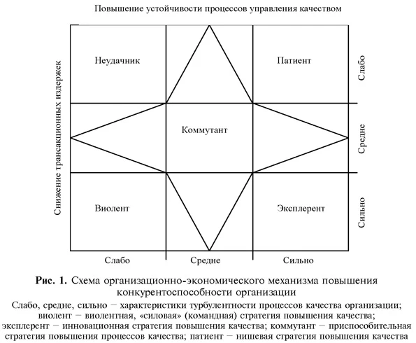 Толстошеина В.А. Наблюдаемая в настоящее время интенсификация экономического роста связана не столько с количественными параметрами известных факторов общественного производства, сколько с глубокими качественными преобразованиями современных микро- и макро- социально-экономических систем. Качество сегодня — это необходимая предпосылка для существования в бизнесе и рассматривается как сильное конкурентное преимущество. Оно обеспечивает высокую лояльность потребителей, высокую долю рынка и высокие дивиденды для инвесторов, а также более низкие расходы и меньшую уязвимость в ценовой конкуренции [1]. Предприятие промышленного кластера, производящее товары и услуги высшего качества, имеет более высокую мотивацию собственного персонала, который удовлетворен имиджем организации, работает более производительно и не создает текучести кадров [2]. Различные вопросы качества и конкурентоспособности в зарубежной экономической науке в той или иной степени нашли свое отражение в работах известных ученых И. Ансоффа, Дж.М. Кейнса, А. Маршалла, К. Мейера, М. Портера, П. Самуэльсона. В исследовании использованы идеи и методологические основы теории качества и конкурентоспособности, заложенные в трудах ведущих российских ученых — Г.А. Азоева, Ю.П. Анискина, В.Я. Белобрагина, Н.В. Войтоловского, Е.А. Горбашко, В.В. Окрепилова, С.В. Пономарёва, Т.А. Салимовой, Р.А. Фатхутдинова, А.Ю. Юданова и др. Основой для создания практического организационно-экономического механизма повышения конкурентоспособности предприятий промышленного кластера должен стать критический и конструктивный анализ современного состояния российского промышленного бизнеса, а также накопленный отечественный опыт, научно адаптированный и практически трансформированный в современную экономическую действительность, что определяет актуальность данного исследования. Цель исследования — научное обоснование и разработка организационно-экономического механизма обеспечения конкурентоспособности предприятия промышленного кластера на базе развития теоретико-методологических и методических подходов менеджмента качества. Методика и результаты исследованияВ наше время предприятия в условиях жесткой конкуренции стремятся объединиться в единую систему управления, учитывая при этом факторы, которые могут повлиять на качество. Большинство предприятий промышленного кластера создают систему качества, опираясь на внешнюю мотивацию. Каждое предприятие надеется на преимущества в конкурентной борьбе, а также стремится укрепить свои позиции на рынке. Поэтому для достижения поставленных целей им необходимо учитывать воздействие как внешних, так и внутренних факторов [3]. Внешняя среда характеризуется факторами воздействия за пределами предприятия. Изучение внешней среды позволяет организации приспособиться к изменяющимся условиям, что обеспечивает высокую конкурентоспособность и эффективную деятельность компании [4]. Система управления качеством, в которой отсутствуют экономические факторы повышения качества, не будет эффективной, так как организационными мерами обеспечить конкурентоспособность продукции невозможно. Рассматривая специфику экономического роста сегодня, следует подчеркнуть, что персонал должен быть высококвалифицированным и образованным