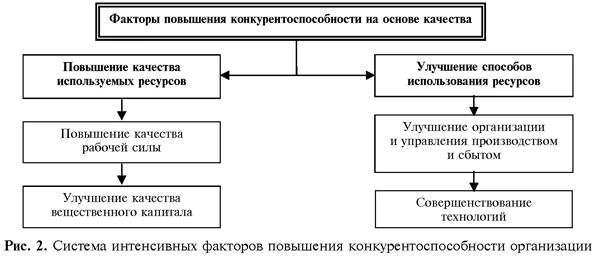 Обоснована программа формирования и развития интенсивных факторов повышения конкурентоспособности организации на основе совершенствования имеющихся схем и механизмов обеспечения качества (рис. 2). Часто понятие «конкурентоспособность» сводится к снижению потерь в использовании ресурсов, однако правильнее под резервами конкурентоспособности понимать неиспользованные возможности снижения текущих и авансируемых затрат материальных, трудовых и финансовых ресурсов при данном уровне развития производительных сил и производственных отношений.