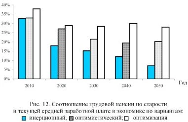 Одновременно с переходом на страховые методы формирования бюджета ПФР необходимо отказаться от регрессивной шкалы и установить верхнюю границу дохода, на который начисляются страховые взносы. Тем самым ПФР примет на себя обязательство по страхованию суммы утраченного заработка для абсолютного большинства застрахованных лиц (в 2010 г. свыше 90% работников будут получать заработную плату (доходы) в пределах 415 тыс. руб. в год (34,6 тыс. руб. в месяц), а в дальнейшем индексировать по темпу роста средней заработной платы в экономике. Установление предельного уровня начисления взносов позволит не только стимулировать их уплату высокодоходными категориями работников, но и ограничит неконтролируемый рост долгосрочных государственных пенсионных обязательств ПФР перед высокооплачиваемыми застрахованными лицами и существенно уменьшит тарифную нагрузку на работодателей. В целях повышения ответственности застрахованных лиц за формирование своих пенсионных прав предусматривается установить нормативный уровень уплаты страховых взносов не ниже стоимости страхового года. За критерий определения ее величины предлагается принять минимальный размер оплаты труда. Благоприятные для сегодняшних пенсионеров результаты реализации актуарных предложений проявятся уже в первые годы. Так, в 2010 г. средний размер трудовой пенсии возрастет с 6,6 тыс. руб., ожидаемых при сохранении действующего законодательства, до 7,9 тыс. руб., т.е. в 1,2 раза (рис. 11). ![]() Соотношение среднего размера трудовой пенсии и ПМП уже в 2010 г. составит 161% вместо планируемых 140%, к 2017 г. достигнет 220%, в 2022 г. - превысит 280%, а к концу прогнозного периода составит 4 ПМП. Таким образом, целевые ориентиры уровня пенсий для старшего поколения пенсионеров и застрахованных лиц (2,5ПМП) будут достигнуты к середине 2020-х годов. Проведенная валоризация, повышение тарифа страховых взносов, постоянная индексация верхней границы доходов, на которую начисляются взносы, в комплексе существенно замедлят снижение коэффициента замещения (соотношения среднего размера трудовой пенсии по старости и средней заработной платы в экономике). При неизменных нормах законодательства уже к 2025 г. средний пенсионер будет получать только 15% среднего заработка работающего человека, т.е. за 15 лет коэффициент замещения снизится на 20 проц. п. Однако при осуществлении предлагаемой программы оптимизационных мероприятий к 2030 г. соотношение среднего размера трудовой пенсии по старости и средней заработной платы в экономике составит 28% (в действующих условиях - 8%), в 2050 г. - 28% (3,4%) (рис. 12). Расчет показателя индивидуального коэффициента замещения (соотношение пенсии в момент ее назначения и заработной платы, с которой застрахованное лицо платило взносы в течение всей трудовой деятельности, осовремененной с учетом роста цен за этот временной период) возможен только в 2030-е годы. К этому времени в системе персонифицированного учета накопится информация о доходе за весь период работы (а для получения пенсии, равной 40% предыдущего заработка, согласно нормам Конвенции МОТ № 102, необходимо выработать 30-летний стаж). Застрахованным лицам, выходящим на пенсию по старости после 2032 г., она будет назначаться в среднем размере, составляющем не менее 42% их предыдущих заработков, а в первые годы - свыше 50%. Так, в 2010 г. он составит 5%, в дейст