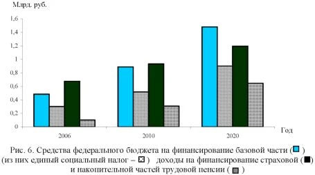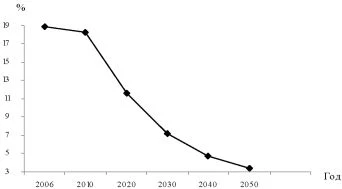Однако суммы текущих поступлений в бюджет ПФР по актуарным расчетам будут снижаться из-за резкого сокращения числа занятых трудовой деятельностью. Возникающую разницу придется покрывать за счет средств федерального бюджета в возрастающем размере: с 1,5% фонда заработной платы в 2010 г. до 4,1% к 2022 г. Вследствие действия этой тенденции страховые принципы финансирования пенсионной системы к 2030 г. почти полностью утрачивают свое значение, так как 89% доходов будут составлять не страховые поступления, а средства федерального бюджета. При одновременном сокращении объема средств на ее финансирование, включая накопительную составляющую, удельный вес системы ПФР сократится с 8,2% ВВП (в том числе на выплату пенсий - 5,5% ВВП) в 2010 г. до 2,0-2.1% ВВП в 2050 г., что недопустимо низко для мировой практики пенсионного страхования. Доля расходов бюджета ПФР в ВВП составит (%):