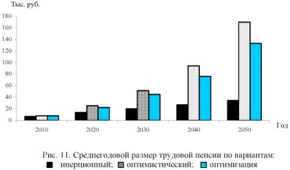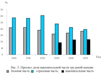 Рассмотрим, насколько принятые целевые ориентиры реализованы в современной пенсионной системе в контексте долгосрочной перспективы. ![]() Тенденции развития пенсионной системы в условиях действующего налогового и пенсионного законодательства. По прогнозным оценкам, разбалансированность бюджета ПФР достигнет своего максимума (1,4% ВВП) в начале 2020-х годов. При этом, если в 2010 г. несбалансированность составит около 18% общего объема средств, направляемых на выплату страховой части трудовых пенсий, то к 2050 г. этот показатель увеличится почти в 5 раз и превысит 85%. Источником покрытия недостающих финансовых ресурсов по действующему законодательству являются средства федерального бюджета, что позволяет говорить не о дефиците пенсионного бюджета, а о финансовой необеспеченности страховых пенсионных обязательств государства. В то же время с точки зрения межбюджетных отношений следует отметить, что темпы роста расходных обязательств федерального бюджета на покрытие дефицита пенсионной системы вплоть до середины 2020-х годов будут опережать темпы роста заработной платы в стране, а в последующем - даже темпы роста цен. Причин для этой негативной тенденции много, и они обусловлены всеми выделенными выше факторами, однако наиболее существенный вклад в нарастание несбалансированности ПФР вносит фактор снижения доли налогово-страховых отчислений на пенсионные цели, определенных действующим налоговым законодательством. В долгосрочной перспективе при сохранении условий формирования пенсионных прав (начисления страховых взносов) объем средств, поступающих в систему обязательного пенсионного страхования, так называемый эффективный тариф страховых взносов, по причине роста размера заработной платы будет сокращаться -с 11,45% в 2010 г. до 0,59% в 2050 г., т.е. почти в 20 раз. Еще больше сократится эффективный тариф взносов на страховую составляющую трудовой пенсии -с 8,8% в 2010 г. до 0,3% в 2050 г., т.е. более чем в 25 раз (рис. 4). ![]() Рис. 4. Изменение суммарного эффективного тарифа взносов на страховую составляющую трудовой пенсии Разница в динамике показателей обусловлена увеличением к середине 2020-х годов части страховых взносов, отвлекаемых на накопительную часть трудовой пенсии в пользу лиц 1967 г. рождения, доля которых достигнет 100% застрахованных лиц трудоспособного возраста к этой дате (рис. 5). Финансирование базовой части трудовой пенсии за счет средств федерального бюджета при условии поддержания в долгосрочной перспективе среднего размера социальной пенсии на уровне прожиточного минимума пенсионера (ПМП), достигаемого к 2010 г., и повышения размеров базовых частей трудовых пенсий, соответствующего росту ПМП, сократится с 8,7% фонда оплаты труда в 2010 г. до 2,1% в 2050 г., или в 4,1 раза (рис. 6). ![]() ![]() Государственные обязательства по финансированию выплаты страховой части трудовой пенсии будут увеличиваться, опережая рост доходов ПФР, исходя из взносов на страховую часть трудовых пенсий и темпов роста заработной платы (табл. 1). Таблица 1 Прогноз трансфертов федерального бюджета в бюджет ПФР в действующих условиях, млрд. руб.