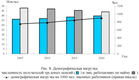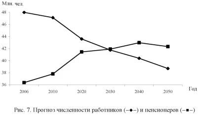 Необходимо отметить и другую тенденцию, связанную с действующим механизмом индексации пенсионных прав, который ограничивает размер индексации темпом роста фактических доходов бюджета ПФР в расчете на каждого пенсионера, с самого начала реформы отстающим от темпов роста среднемесячной заработной платы в стране. В результате, только за период 2002-2007 гг. накопленное отставание увеличилось более чем в 1,5 раза. Отмеченная тенденция в условиях финансового кризиса будет резко усиливаться. Кроме того, начиная с 2012 г. основным фактором, оказывающим влияние на снижение темпов роста доходов ПФР в расчете на каждого пенсионера, становится не увеличение относительной численности пенсионеров (в 1,72 раза за период с 2010 по 2050 г.) (рис. 7) и рост относительного объема страховых взносов, отвлекаемых на формирование пенсионных накоплений в пользу лиц 1967 г. рождения и моложе (вдвое за период с 2010-2025 гг.), а более чем 25-кратное снижение эффективного тарифа страховых взносов на страховую часть трудовой пенсии в условиях роста заработной платы и сохранения регрессивной шкалы базы начисления страховых взносов (см. рис.4). ![]() В связи с этим по причине отставания роста доходов ПФР в расчете на одного пенсионера с середины 2010-х годов, по прогнозным оценкам, от роста цен страховая часть пенсии индексируется лишь раз в год - с 1 февраля только на индекс роста цен за предшествующий год, в результате этого механизм обеспечения сбалансированности доходов и предстоящих обязательств по выплате страховой части пенсий перестает действовать. Сокращение доходных источников бюджета ПФР в действующей пенсионной системе ведет к увеличению масштабов проблемы, связанной с конституционной гарантией сохранения пенсионных прав застрахованных лиц, которые отражаются в показателе «коэффициент замещения»: в долгосрочной перспективе в 2050 г. этот показатель снижается до 3,5% (в 2009 г. - 25,6% и почти 36% до начала пенсионной реформы 2002 г.) (см. рис.2). Это означает, что пенсионная система при сохранении действующих норм формирования пенсионных прав застрахованных лиц не обеспечивает главного принципа обязательного пенсионного страхования - сохранения пенсионных прав всех застрахованных лиц - нивелируя права лиц, имеющих различные объемы расчетного пенсионного капитала, тем самым усиливая неравенство в уровне жизни между работающим и нетрудоспособным населением. Следующий макроэкономический фактор, определяющий негативное воздействие на пенсионную систему, - планируемое сокращение численности лиц, работающих по найму. По прогнозу МЭР, она снизится с 48,5 млн. чел. в 2010 г. до 39,1 млн. чел. в 2050 г., в то время как численность получателей трудовой пенсии, напротив, за этот же период увеличится с 37,3 до 51,7 млн. чел. Таким образом, демографическая нагрузка работающих лиц возрастет с 0,77 до 1,32 чел. (или в 1,7 раза) (рис. 8). ![]() Традиционным способом сохранения пенсионных прав в условиях роста нагрузки на пенсионную систему в практике западных стран являются накопительные компоненты в обязательном пенсионном страховании. Выпадающая из них часть распределительных доходов бюджета ПФР в 2025-2050 гг. теоретически должна замещаться индивидуальными пенсионными накоплениями. Однако по актуарным расчетам объем средств, направляемых на накопление с учетом ожидаемых параметров развития экономики и дох