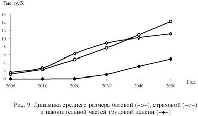 ![]() Рис. 10. Целевые ориентиры развития пенсионной системы Средняя прибавка к трудовой пенсии от валоризации составит свыше 1700 руб. Финансирование валоризации и связанных с ее проведением расходов, включая все последующие индексации трудовой пенсии, в дальнейшем будет осуществляться из федерального бюджета. В 2010 г. расходы только на эти цели составят, по актуарным оценкам, около 510 млрд. руб. Принципиально важным для действенности страховых принципов формирования трудовой пенсии является восстановление прямой зависимости базовой части трудовой пенсии от трудового вклада каждого застрахованного лица, и в первую очередь - от продолжительности трудового вклада и уплаты страховых взносов. Как известно, одним из ключевых положений налоговой и пенсионной реформ являлось финансирование базовой части трудовой пенсии за счет единого социального налога (с 2005 г. - из средств федерального бюджета), что означало ее полный отрыв и независимость от трудового вклада (если не считать ограничения пятилетним минимумом стажа). Нестраховой характер базовой части усиливался механизмом ее индексации, без всякой связи с доходами, имеющимися в распоряжении страховщика, исходя из ориентации на темпы инфляции или приближения к ПМП. При этом размер базовой части не зависит ни от заработка (взносов) застрахованного лица, ни от его стажа (для назначения требуется всего пять лет страхового стажа), что фактически превратило базовую часть трудовой пенсии в социальное пособие, в то время как по своему удельному весу в составе трудовой пенсии она все более вытесняла собственно страховую ее часть. Для этого предлагается перейти на финансирование базовой части трудовой пенсии из средств страховых взносов и индексировать ее в зависимости от роста среднемесячной начисленной заработной платы (не выше роста доходов ПФР в расчете на одного пенсионера). Нормативным условием установления права на базовую часть пенсии является продолжительность страхового стажа - 30 лет, который предусмотрен Конвенцией № 102 МОТ для получения коэффициента замещения пенсии по старости 40% (начиная с 2015 г.). Размер базовой части будет снижаться за каждый год на 3%, если число лет стажа меньше нормативной продолжительности, а за каждый год, превышающий ее, увеличиваться на 6%. Институциональные изменения базовой составляющей пенсии закономерно сопровождаются количественными изменениями в размерах трудовой пенсии. В результате, в 2010 г суммарный размер трудовой пенсии достигнет 7950 руб. (т.е. общее увеличение составит свыше 1,5 раз) при темпе роста средней заработной платы в 2010 г. в 1,19 раза). Для предоставления застрахованным лицам, продолжающим трудовую деятельность, возможности сформировать трудовую пенсию на уровне 40% своего заработка за период страхового стажа предлагается перейти на страховые механизмы формирования доходов бюджета пенсионной системы вместо налогового (единый социальный налог в части, направляемой в федеральный бюджет). Однако размер страховых взносов в отличие от налоговых отчислений должен определяться, исходя из объема накопленных пенсионных обязательств государства, которые рассчитываются актуарными методами. Это позволило обосновать размер тарифа страховых взносов в ПФР в 2010 г. в размере 26%, из которых: