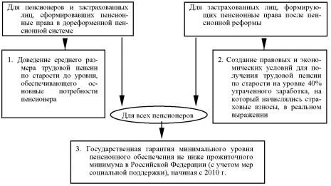 Без реализации мер государственного регулирования макроэкономической и демографической ситуации финансовая стабилизация пенсионной системы возможна только путем приведения ее к страховым принципам. Для обеспечения существенного повышения жизненного уровня пенсионеров в этих условиях необходимо постоянное увеличение ассигнований из федерального бюджета. Актуарное обоснование достижения целевых ориентиров совершенствования пенсионной системы. Исходя из актуарного анализа факторов, текущих и перспективных проблем развития пенсионной системы, целевые ориентиры пенсионного обеспечения должны предусматривать разные способы повышения пенсионного обеспечения должны предусматривать разные способы повышения уровня благосостояния для различных поколений застрахованных лиц: