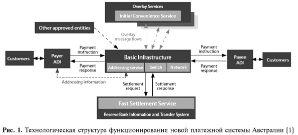 Следует отметить, что возможность прикрепления к платежу подробной информации является очень важным аспектом для бизнеса и менее важным для обычных граждан. В ряде стран, включая Австралию, электронные платежные системы, используемые бизнесом, дают очень ограниченную информацию о платеже — в объеме от 16 до 20 символов. Это одна из причин использования в некоторых случаях чеков в платежах, так как в чеках дополнительная информация может быть указана на оборотной стороне путем скрепления дополнительной бумаги с информацией. Новейшие системы розничных платежей, включая австралийскую NPP, создаются с возможностью передачи значительного количества дополнительной информации. Так, увеличенная информация, которая прикрепляется к платежам, и возможность использовать согласованную структуру данных обеспечивают более широкие возможности для повышения эффективности бизнеса. Исторически сложилось так, что многие страны пользуются единственным национальным стандартом сообщений в платежных системах. Однако так как современные платежные системы интегрируются с другими системами, как отечественными, так и международными, то возникает необходимость применения стандартов сообщений, отвечающих международным стандартам. Относительно новый стандарт — ISO 20022 уже сейчас признают как «единый язык для глобальных финансовых коммуникаций». Многие из существующих мгновенных платежных систем уже в процессе принятия стандартов сообщений ISO 20022, и все новые системы разрабатываются с поддержкой этих стандартов. К примеру, в Европе ISO 20022 является обязательным требованием для обработки платежей в системе SEPA (Европейский платежный совет, 2014). Датская RealTime24/7 и Шведская BiR достигли уровня принятия ISO 20022, в то время как Швейцария пока только обязалась модернизировать свою систему SIC для принятия ISO 20022. Британская система FPS в настоящее время функционирует с использованием альтернативного стандарта ISO 8583. Австралийская NPP также планирует принять стандарт ISO 20022. Широкий подход к созданию инфраструктуры, которая будет поддерживать мгновенные розничные платежи в Австралии, предложен Комитетом по платежам в реальном времени (Real-Time Payments Committee — RTPC) и опубликован в феврале 2013 г. RTPC предложил создание совместной клиринговой системы для обеспечения развития платежной инфраструктуры, к которой финансовые институты будут подключены для осуществления платежей в реальном времени. Эта система, известная как Базовая инфраструктура (Basic Infrastructure — BI), не будет носить коммерческий характер и обеспечит платформу, через которую будут предложены различные платежные услуги. В то время как финансовые организации предложат базовые платежные услуги своим клиентам используя только Базовую инфраструктуру, RTPC ожидает, что в дальнейшем различные дополнительные сервисы смогут воспользоваться Базовой инфраструктурой в коммерческих целях. RTPC также предложил, что дополнительный сервис (overlay service), представленный как «Initial Convenience Service» (ICS — служба первичного входа), будет создан в одно и то же время с Базовой инфраструктурой для обеспечения установления привлекательных условий по использования NPP. Однако BI и ICS составляют два из трех основных компонентов NPP.Вдобавок к ним Резервный банк Австралии разрабатывает Сервис по мгновенным расчетам (Fast Settlement Service — FSS), котор