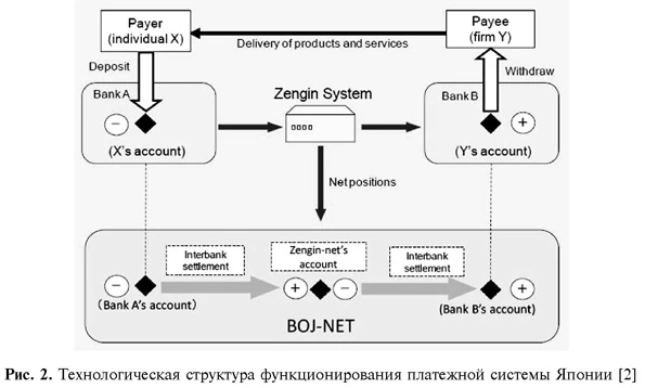 Так, в платежной системе Японии межбанковские расчеты осуществляются через платежную систему Банка Японии (Japan Network System (BOJ-NET)), в которой нетто-позиции рассчитываются через систему Zengin Data Telecommunication System (Zengin System, см. рис. 2).