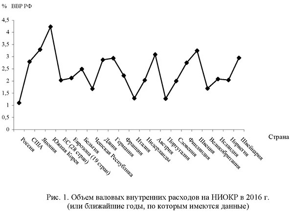 С.В. Кузнецов Технологическая интеграция представляет собой феномен, способный преобразовать внешние и внутренние связи субъектов хозяйствования, которые либо взаимно интегрированы, либо тесно взаимодействуют на период выполнения определенных задач. В первую очередь речь идет о развитии технологий, ориентированных на процессные инновации, включая производство высокотехнологичной продукции глубокой степени переработки, а также о технологиях управления промышленными комплексами на региональном уровне. Конечной целью таких изменений является получение добавленной стоимости по производственной цепочке и цифровизация экономики. Исследование проблем и перспектив развития технологической интеграции обусловлено глобальными вызовами экономического кризиса в нефтяном секторе мировой экономики, резким ухудшением экологической обстановки планетарного масштаба, а также ограничениями и барьерами свободного обращения инновационных идей, технологий и разработок применительно к отдельным странам. О переходе к четвертой промышленной революцииПроцесс перехода экономики страны к формату «Industry 4.0» подразумевает аквизицию научно-исследовательской деятельности практически на всех уровнях управления. Анализ динамики валовых внутренних расходов на НИОКР в России показывает некоторую статичность этого индикатора, его долевое значение в ВВП страны держится в пределах от 1,13% в 2010 г. до 1,10% в 2016 г. [1]. Основной причиной можно назвать неадекватную политику низкого финансирования научной деятельности, в то время как развитые страны целенаправленно поддерживали высокий уровень расходов на проведение испытаний и разработку новейших технологий: США, 2015 г. - 2,79%; Япония, 2015 г. - 3,29%; Южная Корея, 2015 г. - 4,23%; ЕС, 2016 г. - 2,03% ВВП соответствующих государств (рис. 1 [1; 2]).