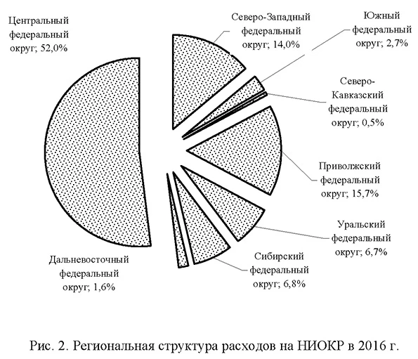 По региональной структуре расходов на научные исследования в России в 2016 г. преобладали инвестиции в Центральном федеральном округе - 52% всех расходов, в Приволжском федеральном округе - почти 16% всех расходов по стране, а также в Северо-Западном федеральном округе - 14% всех расходов [1] (рис. 2).