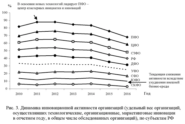 Приволжский, Центральный и Северо-Западный федеральные округа также отличаются преобладанием инновационных предприятий [3] (рис.3). Если общий уровень инновационной активности организаций в 2016 г. составил 8,4% (по сравнению с 9,3% в 2015 г. и 9,9% в 2014 г.), то в Приволжском ФО он достиг 9,4% (по сравнению с 10,6% в 2015 г. и 11,4% в 2014 г.). Более высокие последние показатели отмечались в Центральном ФО: 10,3% (по сравнению с 10,9% в 2014-2015 гг.) [1]. Вместе с тем наблюдается общая тенденция снижения, которая вызвана стагнацией инновационных процессов среднетехнологичных производств, таких как металлургия, производство электрических машин и оборудования. В связи с этим поиск внутренних источников технологического роста входит в число первоочередных задач становления конкурентоспособного промышленного комплекса России. Отечественные предприятия призваны ускорить технологизацию производства за счет разработки и внедрения интеллектуальных систем, а цифровизация экономики выступает рычагом точного воздействия на производственно-хозяйственные отношения между промышленными предприятиями, научно-исследовательскими центрами и лабораториями.