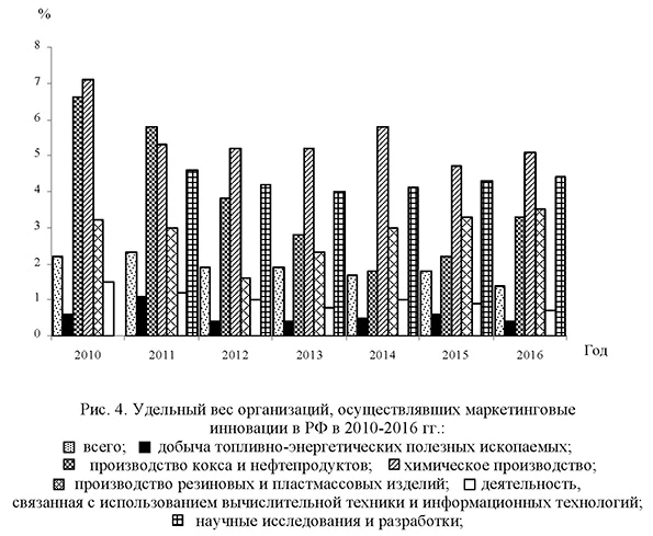 Источник: [7]. Достижение таких параметров во многом зависит от решения проблем технологической отсталости, недостаточного раскрытия научно-технологического потенциала отрасли, сложности расширения транспортной и логистической инфраструктуры, неразвитости системы технического регулирования, отраслевых стандартов и систем контроля качества нефтехимической и химической продукции. Импортная зависимость сокращается вследствие развития собственного производства. Для выхода на прогнозные показатели запущены уникальные проекты, в частности, проект Западно-Сибирского нефтегазохимического кластера с участием ПАО «СИБУР Холдинг» - строительство завода пиролиза в Тобольске мощностью от 1,2 млн. т этилена в год (проект «ЗапСиб-2»), который призван обеспечить ежегодный вклад в ВВП страны в размере свыше 130 млрд. руб., а также ежегодные бюджетные поступления более 10 млрд. руб., при этом будут созданы 9000 новых рабочих мест. Совместный проект Поволжского нефтегазохимического кластера с участием ОАО «ТАИФ-НК», ООО «Газпром нефтехим Салават» позволит увеличить выпуск этилен- и пропиленпроизводных на 2,9 и 1,2 млн. т в год, ежегодно вкладывая в ВВП более 240 млрд. руб., а также с ежегодными бюджетными поступлениями в размере более 10 млрд. руб. и созданием примерно 14000 новых рабочих мест [7]. Суть всех новых проектов состоит в организации производства по принципу «умных технологий». Стимулирование внутреннего спроса на продукцию отечественных производителей планируется осуществлять путем проведения лояльной ценовой политики и внедрения инновационных технологий. Согласно статистике за 2010-2016 гг. лишь незначительная часть промышленных предприятий использовала новые или кардинально улучшенные маркетинговые методы продаж, их представление и продвижение на рынки сбыта, формирование новых ценовых стратегий (рис. 4) [8].