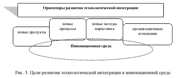 Источник: [1]. Для реализации поставленных планов предприятия проводят политику активного взаимодействия с другими хозяйственными структурами внутри кластеров, с государственными учреждениями, научно-исследовательскими центрами и опытно-конструкторскими лабораториями. На наш взгляд, сложность реализации стратегии перехода на новый технологический уровень обусловлена отсутствием действенных механизмов управленческого характера. С этой точки зрения изучен и структурирован передовой опыт мировых компаний, научно-исследовательских институтов в области развития и продвижения технологий. Ориентиры мировой научной школы технологического развитияОбъективные исследования показывают, что технологическая интеграция1 способна развиваться лишь в благоприятной инновационной среде, в которой складываются предпосылки и условия для разработки и внедрения связанных сложных технологий (рис. 5 [с использованием 9-11]). В последние три-пять лет ученые уделяют особое внимание поиску решений, связанных с формированием инновационной стратегии, ориентированной на использование результатов НИОКР. Исследователи из Китая, Новой Зеландии, США установили связь формирования стратегии с ресурсным обеспечением научно-исследовательских и опытно-конструкторских работ. По наблюдениям за промышленными предприятиями Китая в 2008-2014 гг. установлена прямая зависимость такой стратегии от внедрения улучшающих, модифицирующих, инкрементных инноваций; при этом «радикальные» инновации идут в противоположном направлении от запланированных вариантов развития [12]. Это заключение подтверждает выводы Й. Шумпетера о «разрушительной» силе базовых инноваций, коренным образом преобразующих действующую производственную систему. Ученые отмечают, что ресурсы НИОКР усиливают связь улучшающих инноваций со стратегией предприятия и ослабляют эту связь в случаях с принципиально новыми открытиями.