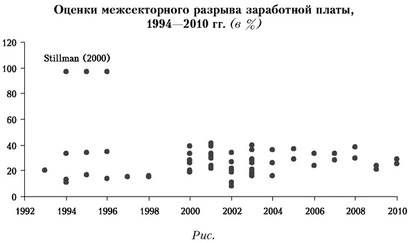Гимпельсон и Лукьянова (2006a) возвращаются к проблеме самоотбора и, используя метод регрессии с переключением, получают отрицательный самоотбор работников в бюджетный сектор и отсутствие значимых результатов применительно к самоотбору в частный. Безусловно, существуют проблемы при использовании разных источников данных, временных интервалов, инструментов, применяемых для идентификации уравнения выбора. Тем не менее авторы не сравнивают свои результаты с результатами предыдущих исследований и не объясняют причины расхождений. Но проблема самоотбора непосредственно связана с качеством рабочей силы, занятой в государственном секторе. Если существует отрицательный самоотбор в государственный сектор, то это означает, что работники, обладающие необходимыми для производства общественных благ характеристиками, предпочитают устраиваться на работу в частный сектор, и наем квалифицированной рабочей силы в государственный сектор усложняется. Ситуация с самоотбором — не единственная загадка. Йованович и Локшин (Jovanovic, Lokshin, 2004) и Гимпельсон и Лукьянова (2006a) приходят к выводу, что межсекторный разрыв среди женщин выше, чем среди мужчин, — это может объясняться большей чувствительностью женщин к немонетарным льготам в госсекторе. При этом Шарунина (2013) получает противоположный результат. Однако не ясно, связано это с разным набором объясняющих факторов или с тем, что рассматривались разные периоды. Конечно, получаемые результаты чувствительны к используемому методу и спецификации модели, но при получении противоречивых относительно предыдущих исследований результатов необходимо объяснить причины расхождений. В-третьих, авторы не принимают во внимание не только ранее полученные результаты, но и разработанные методологии. Например, Гимпельсон и Лукьянова (2006b) при декомпозиции межсекторного разрыва на различные составляющие не учитывают эффект ненаблюдаемых характеристик, как в работе Стиллмана (Stillman, 2000), хотя применяемый ими метод регрессии с переключением для оценки разрыва позволяет это сделать. Стиллман четко обозначил проблему эндогенности выбора сектора и необходимость осторожно трактовать результаты, полученные с помощью МНК-модели. За последующие 14 лет авторы практически не возвращались к этой проблеме, то есть проблему эндогенности все упоминают, но никто не пытается ее решить. Нет ни одного исследования, посвященного изучению факторов выбора индивидом работы в государственном или частном секторе экономики, хотя в мировой литературе существует ряд исследований на эту тему (Christofides, Pashardes, 2002; Clark, Senik, 2006; Demoussis, Giannakopoulos, 2007; Pfeifer, 2011). Отметим также, что метод квантильных регрессий был впервые применен для изучения межсекторного разрыва в 1998 г. (Mueller, 1998) и в последующие годы активно использовался. В российской литературе к этой методологии обратились лишь 15 лет спустя (Шарунина, 2013), и были получены интересные и важные результаты: межсекторный разрыв увеличивается по мере роста заработной платы, то есть у государства возникают наибольшие сложности при найме высококвалифицированной рабочей силы. В-четвертых, в работах, посвященных проблемам недоплаты бюджетникам, работники отраслей образования, здравоохранения и госуправления сравниваются со всеми остальными — работниками предприятий различных форм собс