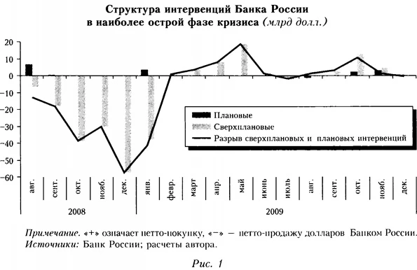 Примечания. * В среднем за год; **январь — ноябрь. Источники: Банк России; расчеты автора. В таких условиях не играли значимой роли и процентные механизмы монетарной политики. Потребность кредитных организаций в привлечении дополнительных финансовых ресурсов покрывалась за счет внешних источников, а средства Банка России оставались не востребованными. В то же время единственным действенным механизмом стерилизации чрезмерной эмиссии выступал Стабилизационный фонд, аккумулировавший часть нефтяных доходов бюджета. Таким образом, при масштабном притоке экспортной выручки и внешних заимствований роль Банка России в реализации не только курсовой, но и монетарной политики в целом была пассивной. Кризисная трансформация механизмов курсообразованияДеятельность Банка России по повышению гибкости курсовой политики активизировалась лишь в середине 2008 г., когда и в мировой, и в российской экономике уже стали заметны признаки финансово-экономического кризиса. В мае 2008 г. Банк России приступил к осуществлению плановых (целевых) операций по покупке иностранной валюты, объем которых определялся на основе оценки фундаментальных факторов (Банк России, 2008). В их числе Банк России рассматривал параметры внешнеторгового баланса и динамику мировых цен на энергоносители. Валютные интервенции, совершаемые монетарным регулятором сверх планового объема, призваны нейтрализовать спекулятивные ожидания экономических агентов, которые провоцируют резкие колебания обменного курса рубля, не связанные с действием фундаментальных факторов. Таким образом, наращивание сверхплановых интервенций Банка России было обусловлено ростом напряженности на мировом финансовом рынке. Абсолютного максимума величина сверхплановых интервенций Банка России достигла в августе 2008 — январе 2009 г., когда чистые продажи американской валюты регулятором превысили 177 млрд долл., при этом в рамках целевых операций он приобрел 10,7 млрд долл. Таким образом, чистые сверхплановые продажи доллара США, осуществленные на рубеже 2008—2009 гг., превысили 188 млрд долл., что отражает не только степень вовлеченности регулятора в деятельность внутреннего валютного рынка, но и уровень валютных рисков, порожденных девальвационными ожиданиями экономических агентов. Но, несмотря на активные действия Банка России, номинальный курс российского рубля к доллару за пять месяцев, с сентября 2008 по январь 2009 г., снизился более чем на 23%. В мировой практике именно на рубеже 2008—2009 гг., то есть в период наиболее острой фазы кризиса, при резком падении темпов роста мировой экономики и развороте финансовых потоков между развивающимися и развитыми странами, возросла востребованность более гибких режимов курсообразования. Из числа стран, входящих в МВФ, доля придерживающихся режима фиксированного валютного курса к апрелю 2009 г. сократилась до 58%. Это означало перелом устойчивого тренда, сформировавшегося в предкризисные годы: к 2008 г. доля стран, гак пли иначе фиксирующих обменные курсы национальной валюты, возросла до 60% по сравнению с 50% в 2001 г. (табл. 3). Максимальный объем чистых продаж американской валюты со стороны Банка России зафиксирован в декабре 2008 г., когда в ходе сверхплановых интервенций было реализовано более 57,4 млрд долл. (рис. 1). Таблица 3 Соотношение стран, придерживающихся различных 