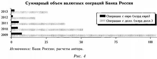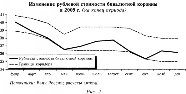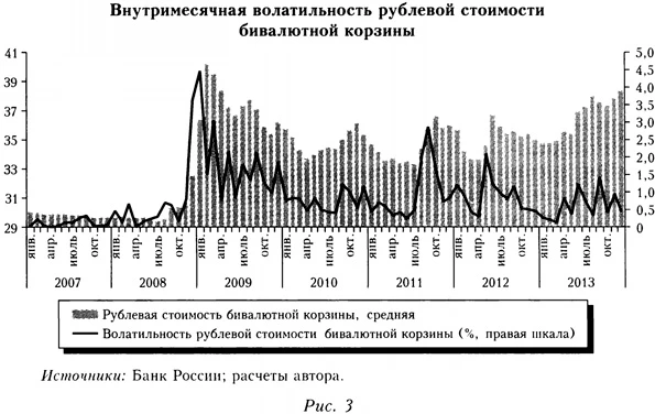Примечание. * По состоянию на 30 апреля. Источники: IMF, 2007; 2012; расчеты автора. ![]() Показательно, что в ноябре—декабре 2008 г. Банк России не осуществлял целевых интервенций, то есть стремительное обесценение российского рубля в этот период стало следствием не столько фундаментальных факторов, сколько панических настроений инвесторов, переводивших финансовые средства в наиболее надежные иностранные активы. Чистый вывоз капитала частным сектором в IV квартале 2008 г. превысил 132 млрд долл. — максимальное значение за всю историю наблюдений с 1994 г. Завершив в конце января 2009 г. масштабную поддержку российского рубля, Банк России существенно трансформировал механизм курсообразования. С февраля 2009 г. обменный курс российского рубля формируется в рамках плавающего операционного внутридневного коридора допустимых значений стоимости бивалютной корзины, границы которого автоматически корректируются в зависимости от объема совершенных регулятором валютных интервенций. Первоначально операционный интервал составлял 2 руб., а накопленная величина интервенций, приводящая к автоматическому сдвигу границ коридора, — 500 млн долл. (Банк России, 2009). Де-факто ограничивать регулирующее воздействие Банк России начал только во второй половине 2009 г. при ослаблении девальвационных ожиданий экономических агентов. Вместе с тем даже в период коррекции валютного курса, последовавшей после панического обесценения российского рубля в августе 2008 — январе 2009 г., основным механизмом поддержания курсовой стабильности оставались сверхплановые валютные интервенции, хотя их объем устойчиво сокращался. Постепенное уменьшение напряженности на внутреннем валютном рынке позволило Банку России в июле 2009 г. расширить границы операционного интервала до 3 руб. (рис. 2). Одновременно до 700 млн долл. был увеличен объем накопленных интервенций, приводящий к сдвигу этих границ, что сдерживало чрезмерную волатильность обменного курса рубля, обеспечивая его устойчивость (Банк России, 2009). Тем не менее если в начале 2009 г. границы операционного интервала были установлены на уровне 38,90 и 40,90 руб., то к концу года — уже на уровне 35 и 38 руб. соответственно. ![]() Помимо этого, к концу 2009 г. Банк России сократил чистый объем целевых операций на валютном рынке до минимального значения 0,6 млрд долл., не прибегая при этом к использованию сверхплановых интервенций. Таким образом, когда спекулятивные тенденции на валютном рынке удалось купировать, Банк России приступил к поэтапному изменению курсовой политики. Как следствие, средняя внутримесячная волатильность рублевой стоимости бивалютной корзины в феврале— декабре 2009 г. возросла до 1,6%, хотя в январе—июле 2008 г., то есть в предкризисный период, она не достигала 0,3%. Более того, в относительно благополучном 2007 г. этот показатель лишь незначительно превышал 0,1%. Фактически вплоть до июля 2008 г. среднемесячная рублевая стоимость бивалютной корзины была фиксированной, более полутора лет находясь в диапазоне 29,42 — 30,07 руб. (рис. 3). ![]() В этих условиях, несмотря на рост внешних заимствований, уровень валютного риска оставался стабильно низким. Так, в банках чистые внешние заимствования только за 2007 г. возросли в 1,7 раза — до 45,8 млрд долл. по сравнению с 27,5 млрд долл. в 2006 г., а уровень их валютного риска1 к концу 2007 г. снизился до 3,6% по сравнению с