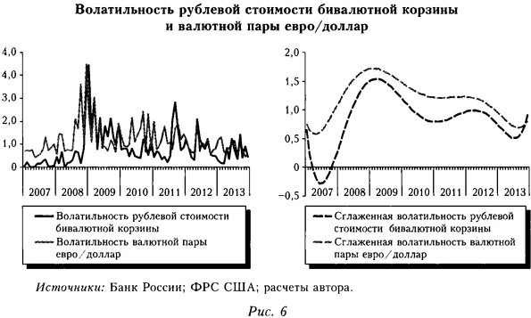 Источник: Всемирный банк. Исключение составил только 2009 г., когда в результате реализации монетарными властями активных мер по недопущению одномоментной девальвации российского рубля соотношение ППС и официального курса доллара к рублю снизилось до уровня 2005 г. — 45%. Однако дальнейшие действия Банка России по повышению гибкости режима курсообразования обусловили восстановление повышательного тренда. Вместе с тем, несмотря на приближение к ППС, российский рубль относительно доллара США остается существенно недооцененным. Заниженный курс национальной валюты по отношению к доллару — характерная особенность курсовой политики развивающихся стран. Так, в Китае, курсовая политика которого вызывает немало дебатов относительно необходимости придерживаться более гибкого подхода (IMF, 2013; Morrison, Labonte, 2011; White House, 2010; G7, 2013), соотношение ППС китайского юаня и его рыночного курса к 2012 г. достигло 67%. Наиболее либеральный режим курсовой политики, о чем свидетельствует практически полное совпадение официального курса и ППС, применяется в Бразилии, а индийская рупия по отношению к доллару США по-прежнему самая недооцененная (см. табл. 5). Принципиально иная ситуация в развитых странах, где соотношение ППС и официального курса доллара США к национальным валютам превышает 100%4. Официальные курсы их национальных валют, как правило, завышены по отношению к доллару, что поддерживает привлекательность импорта товаров и услуг. Наиболее близок к ППС официальный курс евро по отношению к доллару (в 2012 г. превышение оценивалось в 101%, а в 2008 г. был достигнут максимум — 119%). Аналогично и движение фунта стерлингов: соотношение его ППС и обменного курса снизилось со 129% в 2007 г. до 104% в 2012 г. Вместе с тем официальные курсы японской иены и швейцарского франка в посткризисный период продолжали отдаляться от ППС. Максимум был зафиксирован в 2011 г., когда ППС швейцарского франка на 63% превысил его обменный курс, а японской иены — на 36%. В 2012 г. этот дисбаланс был несколько скорректирован. Негативные макроэкономические тенденции в сочетании с активным стимулированием деловой активности органами государственного управления в Японии и Швейцарии в 2012 г. прервали многолетний тренд укрепления их национальных валют. Как следствие, соотношение ППС и официального курса швейцарского франка снизилось до 148%, а японской иены — до 133%. Изменяясь под воздействием рыночных факторов, курсовые показатели отражают настроения инвесторов и их восприятие экономических рисков. Политические высказывания и решения органов власти, выход новой макроэкономической статистики или бухгалтерских балансов крупных корпораций способны изменить вектор движения обменного курса. В этих условиях волатильность рублевой стоимости бивалютной корзины достигла максимума 1,4% в сентябре 2013 г., а волатильность ключевой валютной пары евро/доллар в этот период лишь незначительно превышала 1% (рис. 6). По мере повышения гибкости курсовой политики и снижения объемов валютных интервенций Банка России волатильность рублевой стоимости бивалютной корзины в 2013 г. не только вплотную приблизилась к уровню ключевой валютной пары евро/доллар — национальных валют ведущих экономик мира, соотношение которых формируется в рамках свободно плавающего валютного курса, но и превзошла его (см. рис. 6). ![]() Согласно класс