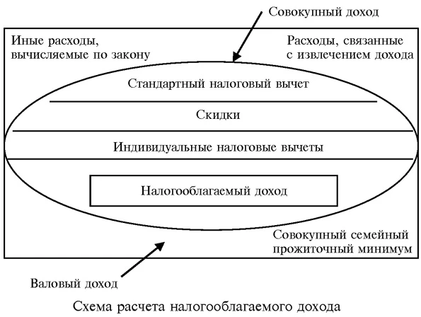 Эти изменения налогового законодательства во многом способствуют оптимизации налогообложения доходов физических лиц, являются основой создания оптимальной правовой модели налога на доходы физических лиц. Однако данный набор мер представляется нам недостаточным. Например, наличие в семье инвалида или тяжелобольного человека существенно увеличивает общие расходы семьи на лечение. В целях поддержки государство предоставляет таким семьям льготы в виде налоговых вычетов, связанных с расходами на свое лечение и лечение членов своей семьи. При этом размер вычетов из налоговой базы является стандартным для всех налогоплательщиков (13 % НДФЛ), а также неработающих граждан, независимо от фактической способности осуществлять такие расходы, а значит, и от возможности пользования подобными вычетами. Вышеизложенное касается и имущественных вычетов (ст. 220 НК РФ). По действующему законодательству чем выше доход налогоплательщика, тем значительнее размер имущественного вычета. Возникает вопрос, смогут ли воспользоваться имущественным вычетом малоимущие слои населения. На сегодняшний момент налоговое законодательство имеет некоторые пробелы в вопросах налогообложения социально незащищенных слоев общества [5]. Таким образом, основной проблемой действующей системы налоговых вычетов по налогу на доходы физических лиц является их недостаточный размер, отсутствие корректировки на инфляцию и дифференцированного подхода, учитывающего возможность налогоплательщиков воспользоваться такими расходами. Для решения поставленной проблемы необходимо увеличить сумму вычетов в абсолютном выражении с учетом специфики региональной и местной дифференциации, фактической платежеспособности и семейного положения налогоплательщиков. Условно назовем такие вычеты семейными. С учетом опыта развитых стран в основе расчета налогооблагаемого дохода можно использовать следующую формулу для расчета налогооблагаемого дохода семьи — НД:НДс = ВД — (Ор + Пр ) = Сд — Нв — Вс где ВД — валовой доход; Ор — основные расходы, связанные с извлечением дохода; Пр — прочие расходы; Сд — совокупный доход; Нв — налоговый вычет (стандартный, имущественный, социальный). Данную формулу возможно скорректировать на показатель совокупного семейного прожиточного минимума по регионам (см. рисунок).