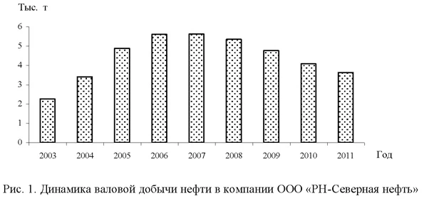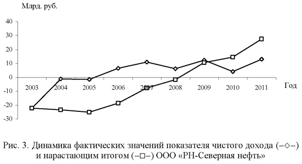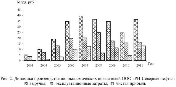 Часто при упоминании о сделке по покупке активов ОАО «Северная нефть» приводятся данные, что фактическая стоимость приобретаемых активов была завышена3. Исходя из цены сделки в 600 или 622,6 млн. долл. (см. выше - данные экспертов ABN Amro Bank о стоимости ОАО «Северная нефть» на дату совершения трансакции), стоимость приобретения барреля доказанных запасов УВ в нефтяном эквиваленте (boe) находится в диапазоне 0,59÷0,61 долл./boe. На фоне динамики средней мировой стоимости покупки барреля запасов в 2003 г. 3,83 долл./boe продажа данного объекта нефтегазового бизнеса в Тимано-Печорской НГП вместе с лицензиями на поиск, разведку и добычу выглядит явно недооцененной [5]. ![]() Основные показатели, характеризующие развитие компании ООО «РН-Северная нефть» в структуре ОАО «НК «Роснефть» представлены на рис. 1-3 [16]. В частности, на рис. 3, наглядно показано, что после 2008 г. первоначальные инвестиции ОАО НК «Роснефть» в приобретение компании ОАО «Северная нефть» полностью окупились, поскольку отрицательная величина чистого дохода нарастающим итогом, сформированная за счет затрат на покупку компании в 2003 г., после 2008 г. приобретает только положительные значения. ![]() По оценке экспертов компании DeGolyer & MacNaughton, дисконтированная стоимость денежных потоков, которые потенциально способна генерировать ОАО «Северная нефть» составляет 1639 млн. долл.4 [7], или 48268,6 млн. руб.