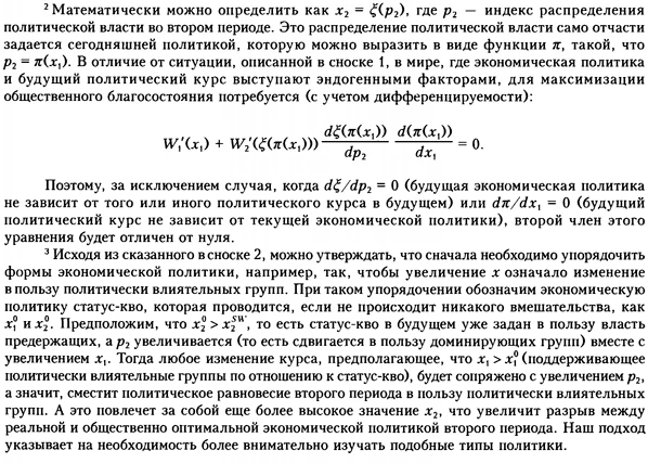 Среди экономистов существует общее убеждение (которое, правда, может и не формулироваться явно), что государственная политика по возможности должна быть нацелена на поиск способов уменьшить или устранить провалы рынка и искажения экономической политики. Мы утверждаем, что такой вывод часто оказывается ошибочным, поскольку не учитывается политический аспект. На самом деле сложившееся политическое равновесие может в существенной мере зависеть от наличия провалов рынка. Экономические реформы, проводимые без осознания их возможных политических последствий, могут не повысить экономическую эффективность, а серьезно ее снизить. Наша логика связана с классическим анализом «второго наилучшего» решения (Lancaster, Lipsey, 1956), но все же отличается от него по двум причинам. Во-первых, в центре нашей аргументации не взаимодействие нескольких провалов рынка, а влияние текущих изменений экономической политики на достижение политического равновесия в будущем. Во-вторых, еще очень много надо сделать в смысле анализа взаимосвязей между экономической политикой и будущим политическим равновесием, но наш подход не сводится к тому, что любые экономические реформы могут неблагоприятно сказаться на этом равновесии. Скорее, опираясь на политико-экономические идеи, мы подчеркиваем, что нужно особенно аккуратно относиться к влиянию на политическую сферу тех экономических реформ, которые изменяют структуру распределения дохода или ренты в обществе, причем в пользу уже имеющих влияние социальных групп. В таких случаях благонамеренная экономическая политика может изменять баланс политических сил, усиливая положение господствующих групп, тем самым порождая весьма неблагоприятные последствия для будущего политического равновесия. Безусловно, мы не первые, кто обращает внимание на значимость политико-экономического анализа экономической политики и на то, что стандартный анализ выгод и издержек экономической политики неадекватен, поскольку именно политика в нем и не учитывается. Начиная с 1980-х годов в политико-экономической литературе активно предпринимаются попытки разработать позитивные модели, описывающие, как на самом деле выбирается та или иная политика, что включает моделирование политической сферы и процесса принятия решений (Drazen, 2000; Persson, Tabellini, 2000; Besley, 2007; Acemoglu, Robinson, 2006). Но при этом в современном политико-экономическом анализе либо не затрагиваются эти проблемы, либо говорится, что нужно устранять провалы рынка, насколько это возможно с политической точки зрения. Некоторые утверждают, что рекомендации в области экономической (или институциональной) политики должны учитывать важное ограничение: экономическая политика всегда выбирается как элемент политического равновесия, а значит, в этих рекомендациях следует ограничиться тем, что политикам представляется совместимым по стимулам (Dixit, 1997; Drazen, 2002). Тем не менее, насколько нам известно, главную нашу идею никто еще не предлагал. Она состоит в том, что экономическая политика не должна сосредоточиваться только на устранении провалов рынка и корректировке экономико-политических искажений. Его потенциальное влияние на политические равновесия в будущем тоже должно стать важным фактором, особенно если это касается распределения дохода и ренты в пользу имеющих влияние групп. Таким