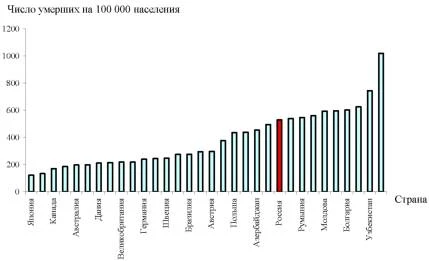 Отметим также, что помимо высокого уровня смертности, болезни ССЗ являются причиной высокой инвалидизации населения (табл. 4). Согласно межстрановым сопоставлениям смертности от ССЗ, коэффициенты смертности от этой причины в РФ значительно (в 2-4 раза) превышают аналогичные показатели более развитых в экономическом отношении стран (рис.1). Таблица 4 «Вклад» ССЗ в инвалидизацию населения РФ