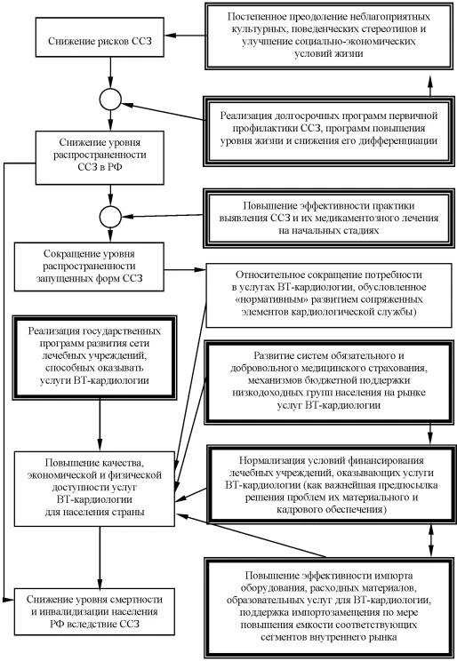 Как показано на рис. 3, несмотря на высокие темпы развития ВТ-кардиологии в России в последние годы, эти разрывы остаются многократными, следовательно, многократным является и потенциал роста этого сектора здравоохранения. Именно это актуализирует разработку долгосрочной политики развития ВТ-кардиологии как важного элемента национальной стратегии борьбы с ССЗ. Концепция развития ВТ-кардиологии должна основываться на четком определении ее роли в решении общей проблемы снижения риска смерти от ССЗ. Для этого потребуется установить круг проблемных ситуаций и сформировать сценарий объема потребностей в соответствующих процедурах во времени с учетом успешной реализации прочих мероприятий, образующих комплексную политику борьбы с гиперсмертностью от ССЗ. Следовательно, «нормативный» сценарий развития ВТ-кардиологии зависит от состава реализуемых мер, их распределения во времени и от того, в какой степени удастся обеспечить положительные системные эффекты и избежать потерь от их рассогласованности. Вследствие большого числа факторов риска ССЗ, часть из которых имеет социально-экономическую обусловленность, часть связана с другими заболеваниями, политика противодействия им должна иметь столь же комплексный характер. При этом прогресс в социально-экономической сфере или в отношении «сопряженных» заболеваний может оказать положительное влияние и на распространенность ССЗ. Уровень доходов определяет не только платежеспособность на рынке медицинских услуг, но и особенности текущей системы потребительских ориентиров, а также ресурсные возможности финансирования «здорового» рациона питания и других расходов, связанных с поддержанием здоровья - занятий физической культурой, отдыха - и их реальную приоритетность при формировании расходов домашних хозяйств. В нашей стране рост уровня жизни населения в перспективе (учитывая чрезвычайно высокую дифференциацию населения по среднедушевым доходам) может оказать нетривиальное воздействие на распространенность ССЗ: снижение рисков ССЗ в верхних доходных группах, в которых распространение элементов здорового образа жизни будет происходить в условиях уже достигнутого насыщения рациона качественными видами пищи, может сопровождаться ростом рисков ССЗ в нижних доходных группах вследствие того, что для них важнейшим направлением совершенствования рациона питания будет увеличение потребления дешевых мясных и молочных продуктов, содержащих холестерин. Объективная необходимость «погружения» политики развития ВТ-кардиологии в контекст более общей комплексной многоаспектной политики противодействия ССЗ, которая имеет достаточно большой временной горизонт, определяется тем, что положительные изменения в структуре факторов риска и в уровне популяционной распространенности ССЗ обычно происходят очень медленно, а без них ВТ-кардиология будет испытывать избыточную экономическую и социальную нагрузку как компенсатор отсутствующих или недостаточно развитых элементов системы противодействия ССЗ. На рис. 4 приведена схема, иллюстрирующая основные элементы и общую логику реализации политики снижения уровня смертности и инвалидизации населения РФ от ССЗ. Прежде всего, важно отметить, что базовые элементы этой политики давно сформулированы, а в некоторых страна