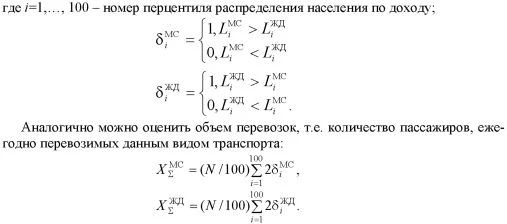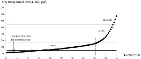 (Источник оценок крейсерских скоростей и постоянных составляющих длительности поездки [5], оценки величин километровых тарифов соотносились с данными Минтранса России и ОАО «РЖД» [3, 4]). На рис. 1 изображены полученные с помощью предлагаемой модели графики зависимости максимальной дальности поездок, совершаемых в течение года на самолете и на поезде, от величины среднедушевого дохода L=ƒ(M). ![]() Сравнение графиков показывает, что услугами авиатранспорта, согласно предлагаемой модели, будут пользоваться индивиды, имеющие среднедушевой доход свыше 27 тыс. руб./мес. Если же в рамках данного примера среднемесячный доход индивида окажется ниже 4,8 тыс. руб., он вообще не будет совершать дальних поездок4. Сопоставляя эти пороговые значения дохода с приведенными выше среднемесячными доходами децильных групп, можно предположить, что представители первых трех групп вообще не будут совершать дальних поездок, а воздушный транспорт предпочтут лишь представители 10-го дециля. По оценкам [1, 2, 9] коэффициент доступности авиаперевозок (для той доли населения, которая может позволить себе совершать авиаперелеты) в современной России составляет 3-7%, т.е. менее 10%. Для повышения разрешающей способности модели можно использовать в расчетах более подробное разбиение населения по величине среднемесячного дохода - не на децили, а на перцентили, т.е. на однопроцентные группы населения. При этом необходимо аппроксимировать кривую распределения населения по доходам на основе данных о доходах децильных групп. Результаты аппроксимации приведены на рис. 2. Заметим, что оценки доходов представителей верхних перцентилей, полученные в результате аппроксимации, превышают средний доход представителей 10-го дециля. На рис.2 показаны уровни дохода, при которых индивиды, согласно предложенной модели, будут совершать дальние поездки на поезде или самолете. Эти же пороговые уровни дохода можно увидеть и на рис. 1. ![]() Рис. 2. Аппроксимация распределения населения России по доходам в 2006 г. и пороговые значения душевого дохода Оценки суммарных значений пассажирооборота воздушного и железнодорожного транспорта в рамках данной модели можно получить, суммируя пассажиро-оборот для всех перцентилей, для которых данный вид транспорта является наиболее предпочтительным (дальность ежегодных поездок необходимо умножить на 2, поскольку пассажир совершает поездку туда и обратно): ![]() Предложенная в данной работе модель формирования спроса на туристические поездки в принципе не предполагает многократных поездок одним пассажиром в течение года (следовательно, применима только в неблагоприятной социально-экономической ситуации, когда коэффициент подвижности населения не достигает одной поездки в год). Тем не менее в реальности состоятельные граждане совершают несколько поездок в год, что оказывает существенное влияние на показатели работы пассажирского транспорта. Согласно оценкам, выполненным в работе [1], среднее количество авиаперелетов, совершаемых за год, приблизительно одинаково для граждан развитых стран мира и для россиян с аналогичным уровнем дохода. Отношение пассажирооборота данного вида транспорта к объему перевозок отражает среднюю дальность поездок на данном виде транспорта: ![]() Разумеется, предложенная модель спроса на дальние перевозки является чр