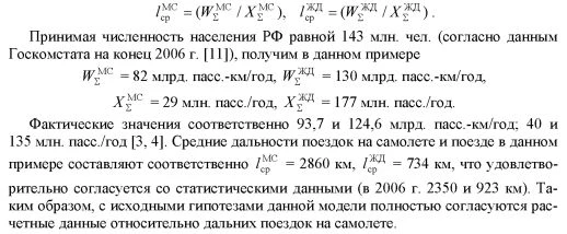 Для иллюстрации расчетов по предлагаемым моделям примем следующие исходные данные: прожиточный минимум Мmin = 3700 руб. в месяц (что соответствовало значению прожиточного минимума в России в начале 2007 г. [11]); доля расходов сверх прожиточного минимума, выделяемая на дальние поездки α = 5%; стоимость часа времени пассажира составляет 0,5% его среднемесячного дохода. Основные технико-экономические параметры воздушного и железнодорожного транспорта, необходимые для оценки длительности и стоимости поездок, приведены в табл. 1 Таблица 1 Некоторые технико-экономические параметры воздушного и железнодорожного транспорта