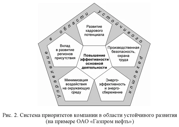 При создании доктрины устойчивого развития НГК необходимо учесть опыт структурной перестройки в США, где при разработке месторождений в нефтедобывающих районах (с падающей добычей), нефтяные компании снижали с течением времени текущие расходы на капитальный ремонт скважин в соответствии с уровнем добычи. При этом, естественно, они не тратили средства на повышение коэффициента извлечения нефти. Такую политику в середине прошлого века практиковали крупные нефтяные компании, у которых общая себестоимость добычи была очень высока. Оценив негативные последствия такого развития НГК, американское правительство построило иную систему эксплуатации месторождений, которая устроила бизнес [9]. Лицензии на разработку новых месторождений (практически с нуля) получали по контракту крупные компании, которые добывали 25-30% легко извлекаемых (на естественном режиме) запасов нефти. Затем они продавали месторождения (в целом, частями, поскважинно) компаниям среднего уровня. Последние вырабатывали еще 25-30% нефти (до предела своей себестоимости).Следующий (заключительный) этап разработки осуществляли мелкие владельцы, которые покупали у компаний среднего уровня отдельные скважины. Эти владельцы (хозяева магазинов, кафе, баров, фермеры и др.) имели обычно от одной до пяти-семи скважин, но в целом в их собственности на сегодняшний день оказалось более 90% скважин, пробуренных на нефть в пределах территории США. При этом владельцы получают значительный доход от скважин, поскольку обслуживанием оборудования вплоть до сдачи нефти и газа в государственную систему сбора продукции занимаются сервисные операторские компании. Приоритеты устойчивого развития НГКВ Российском НГК приоритеты в области устойчивого развития при освоении шельфа северных морей определила ОАО «Газпром нефть» (см. [11]). Система приоритетов компании включает все элементы современной модели устойчивого развития (рис. 2)2.