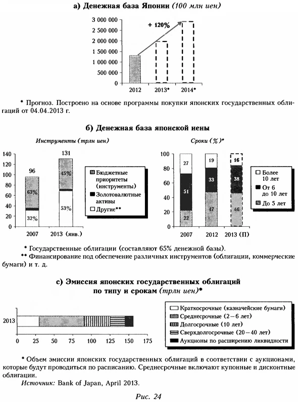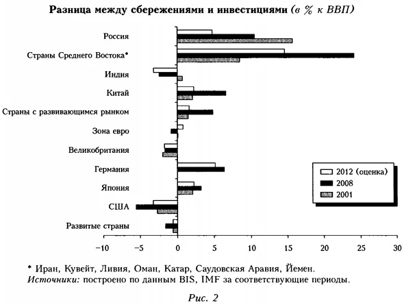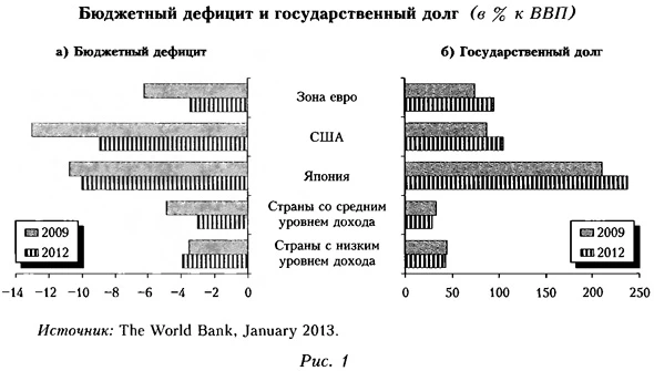 д. э. н. проф. Финансового университета при Правительстве РФ член Межрегионального банковского совета при Совете Федерации РФ (Москва) В сентябре 2013 г. исполнилось пять лет с момента объявления банкротства американского инвестиционного банка Lehman Brothers, которое ознаменовало начало широкомасштабной фазы мирового финансового кризиса. За истекшие годы регуляторы всех стран приложили немало усилий, чтобы стабилизировать ситуацию и обеспечить экономический рост. Однако «риски возможного снижения глобального роста преобладают», — утверждается в вышедшем в июле 2013 г. докладе МВФ. «При сохранении старых рисков возникли новые. Среди них — вероятность более продолжительного замедления роста на развивающихся рынках», в том числе с учетом возможного сокращения кредитования, более жестких финансовых условий и других факторов (IMF, 2013а. Р. 1). И для мира в целом, и для большинства стран прогнозы роста ухудшились (см. табл. 1). При этом для российской экономики прогноз роста снижен более чем на 30% (относительно оценок, сделанных в апреле). МВФ подчеркивает, что для ускорения роста в мире необходимо использовать дополнительные меры (IMF, 2013а. Р. 1). Однако применение стимулирующих мер — например расширение госрасходов, ведущее, в частности, к сохранению бюджетного дефицита и росту госдолга, решая одни проблемы, одновременно сохраняет или обостряет другие, не позволяя в том числе эффективно решать системную проблему глобальных дисбалансов (см. рис. 1). Таблица 1 Прогноз ежегодного прироста ВВП для ряда стран и регионов (в %)